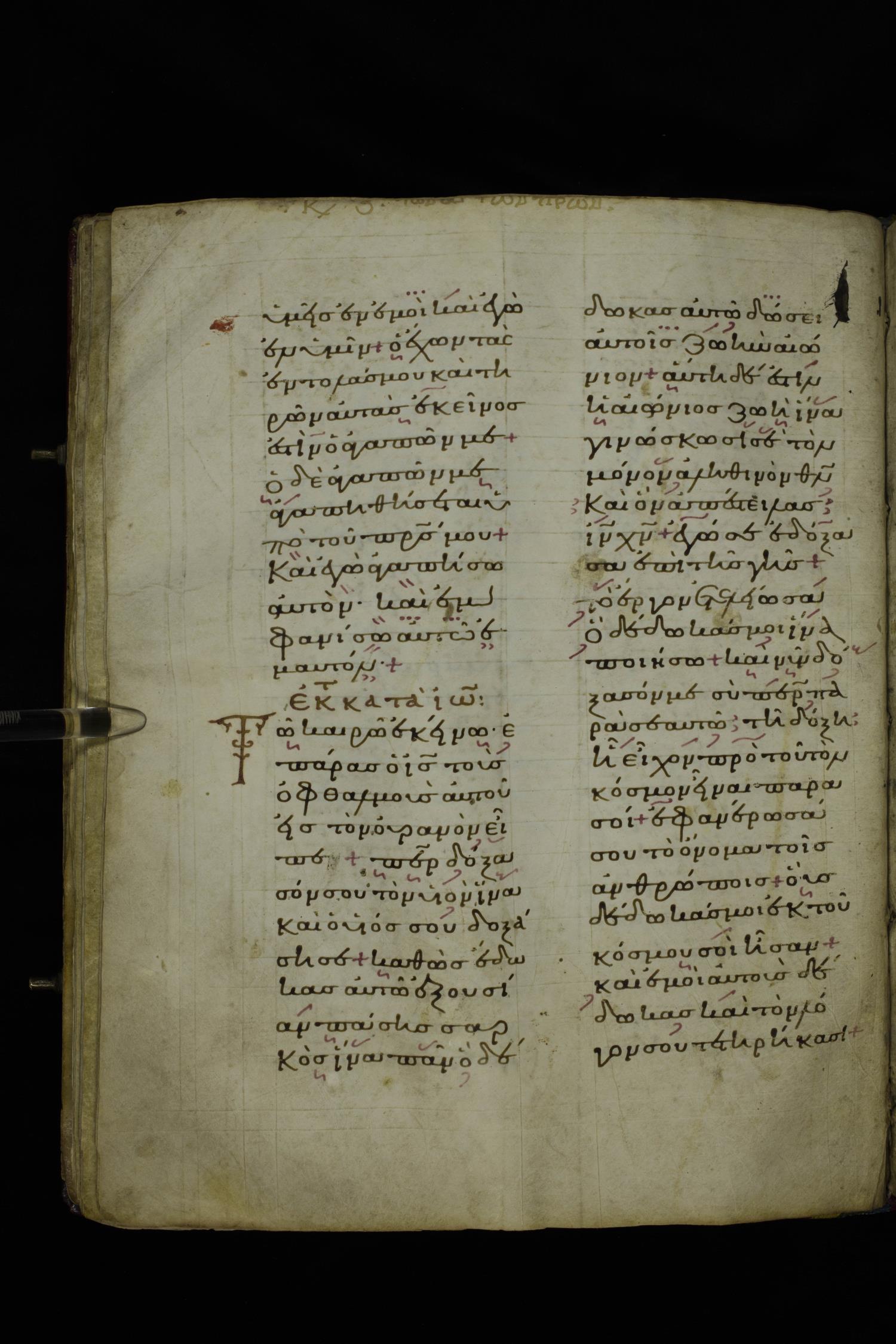 Twelfth century lectionary of the Gospels on parchment; 220 leaves, 2 columns, 24 lines per column. Images were taken at the National Library of Greece in Athens.