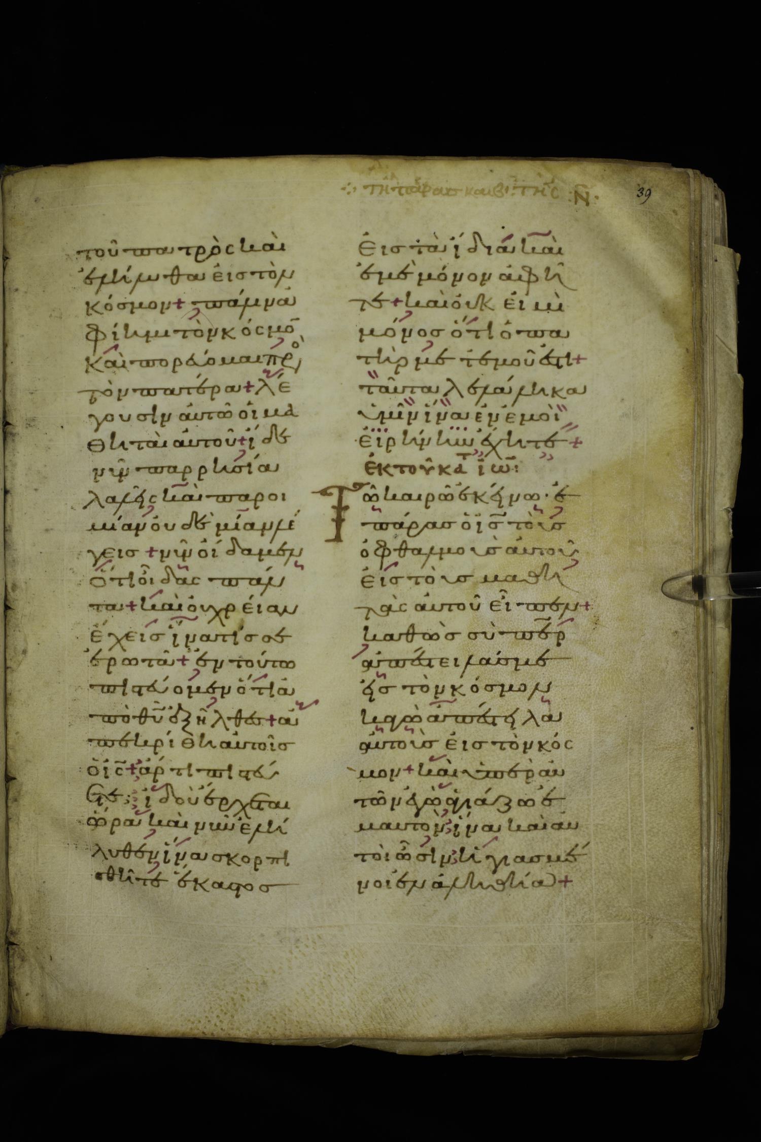 Twelfth century lectionary of the Gospels on parchment; 220 leaves, 2 columns, 24 lines per column. Images were taken at the National Library of Greece in Athens.
