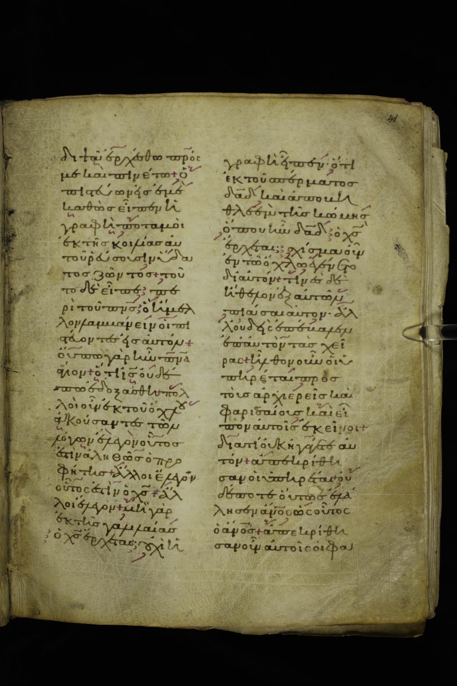 Twelfth century lectionary of the Gospels on parchment; 220 leaves, 2 columns, 24 lines per column. Images were taken at the National Library of Greece in Athens.