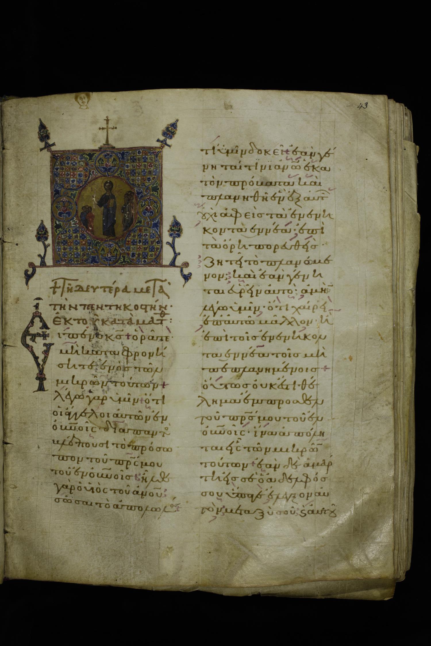 Twelfth century lectionary of the Gospels on parchment; 220 leaves, 2 columns, 24 lines per column. Images were taken at the National Library of Greece in Athens.