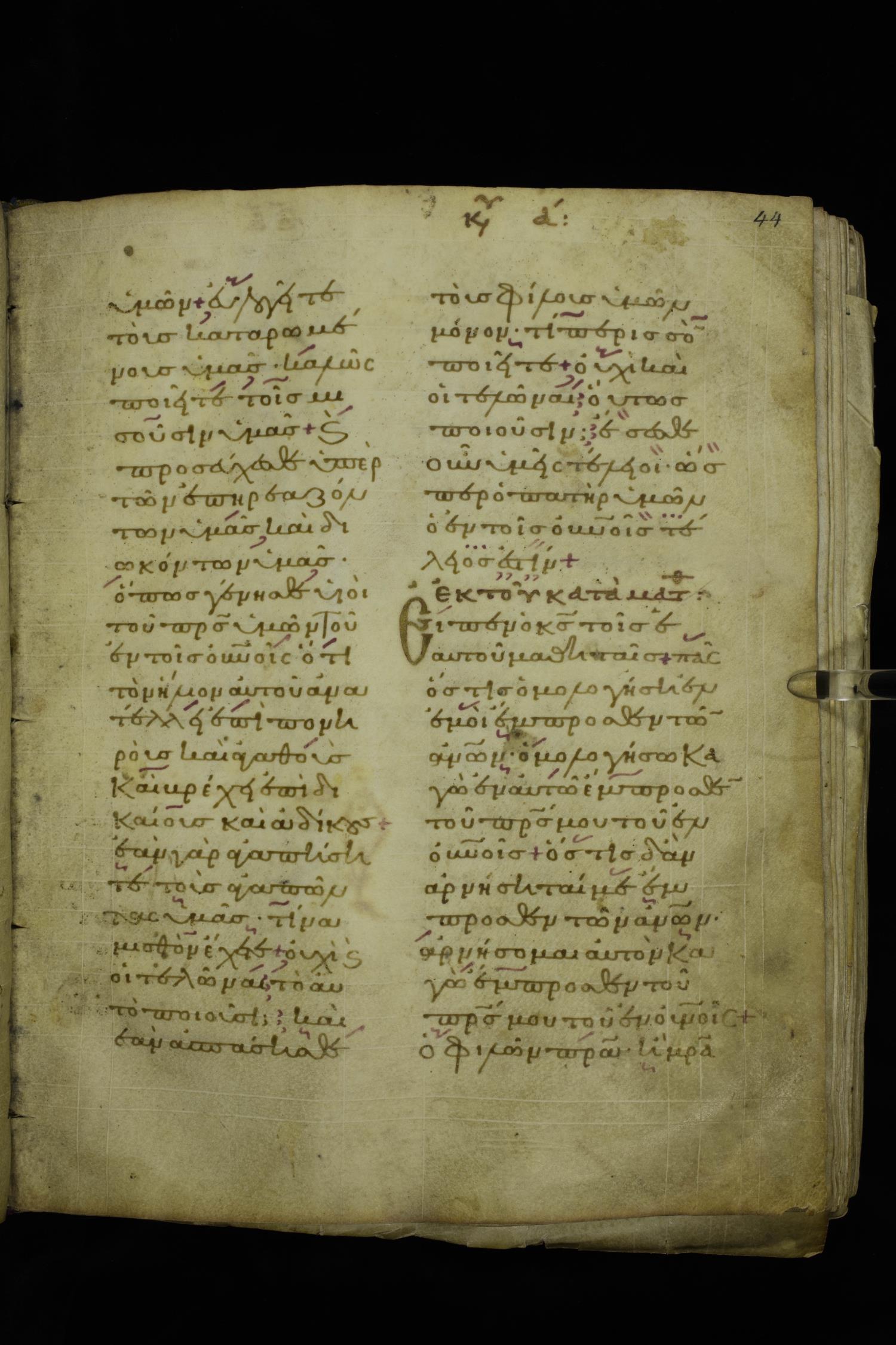 Twelfth century lectionary of the Gospels on parchment; 220 leaves, 2 columns, 24 lines per column. Images were taken at the National Library of Greece in Athens.