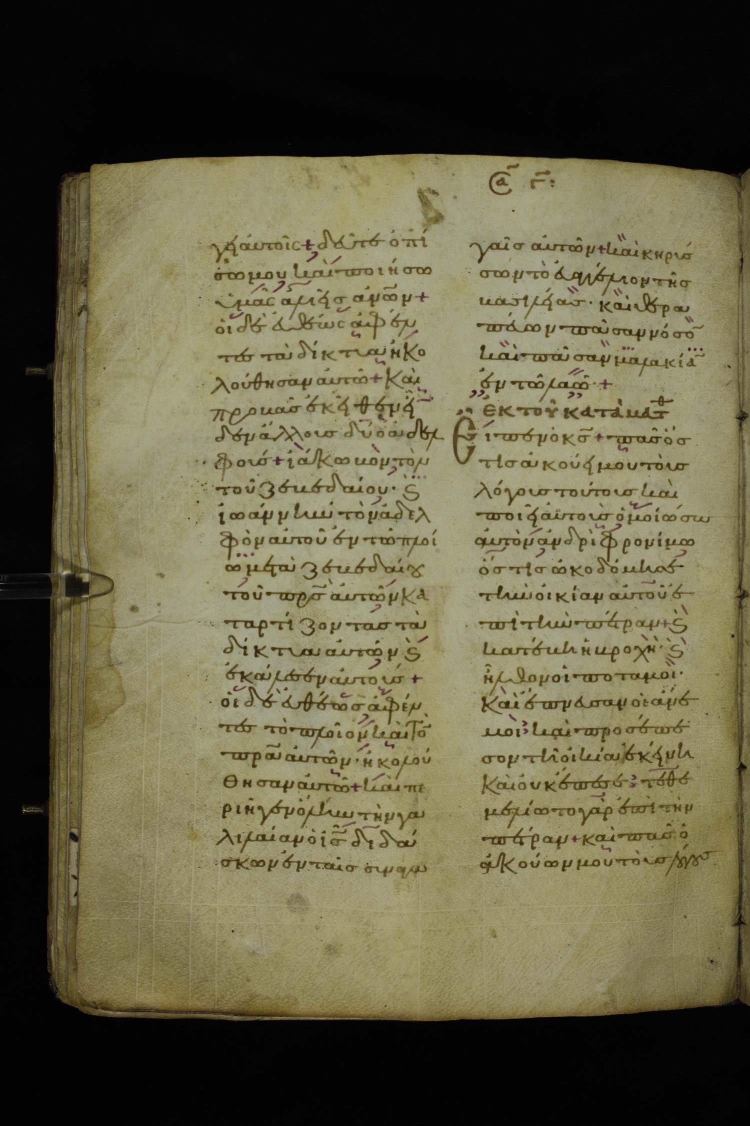 Twelfth century lectionary of the Gospels on parchment; 220 leaves, 2 columns, 24 lines per column. Images were taken at the National Library of Greece in Athens.