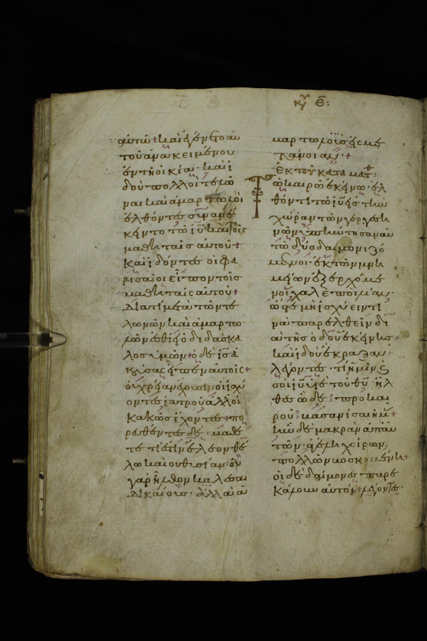 Twelfth century lectionary of the Gospels on parchment; 220 leaves, 2 columns, 24 lines per column. Images were taken at the National Library of Greece in Athens.