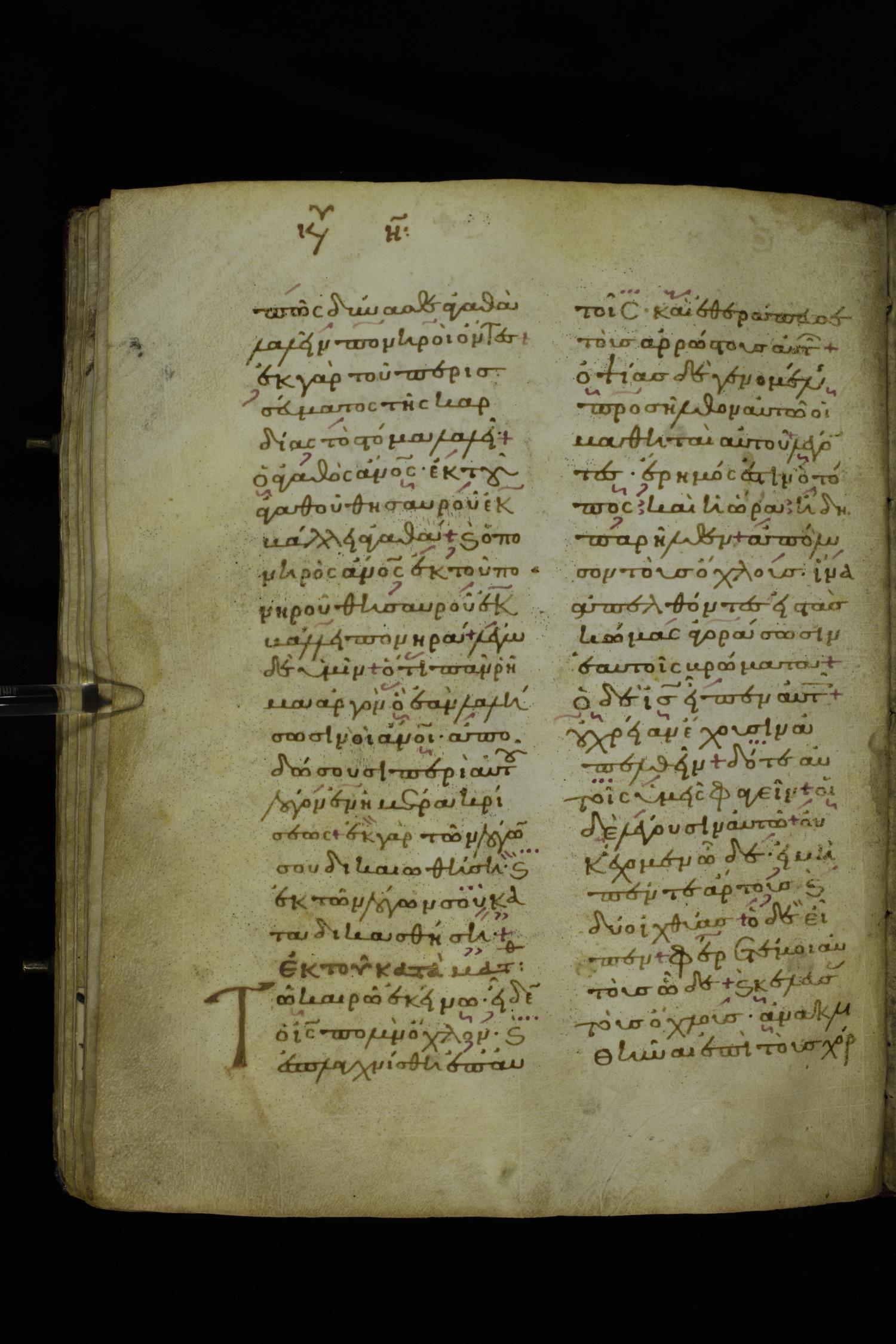 Twelfth century lectionary of the Gospels on parchment; 220 leaves, 2 columns, 24 lines per column. Images were taken at the National Library of Greece in Athens.