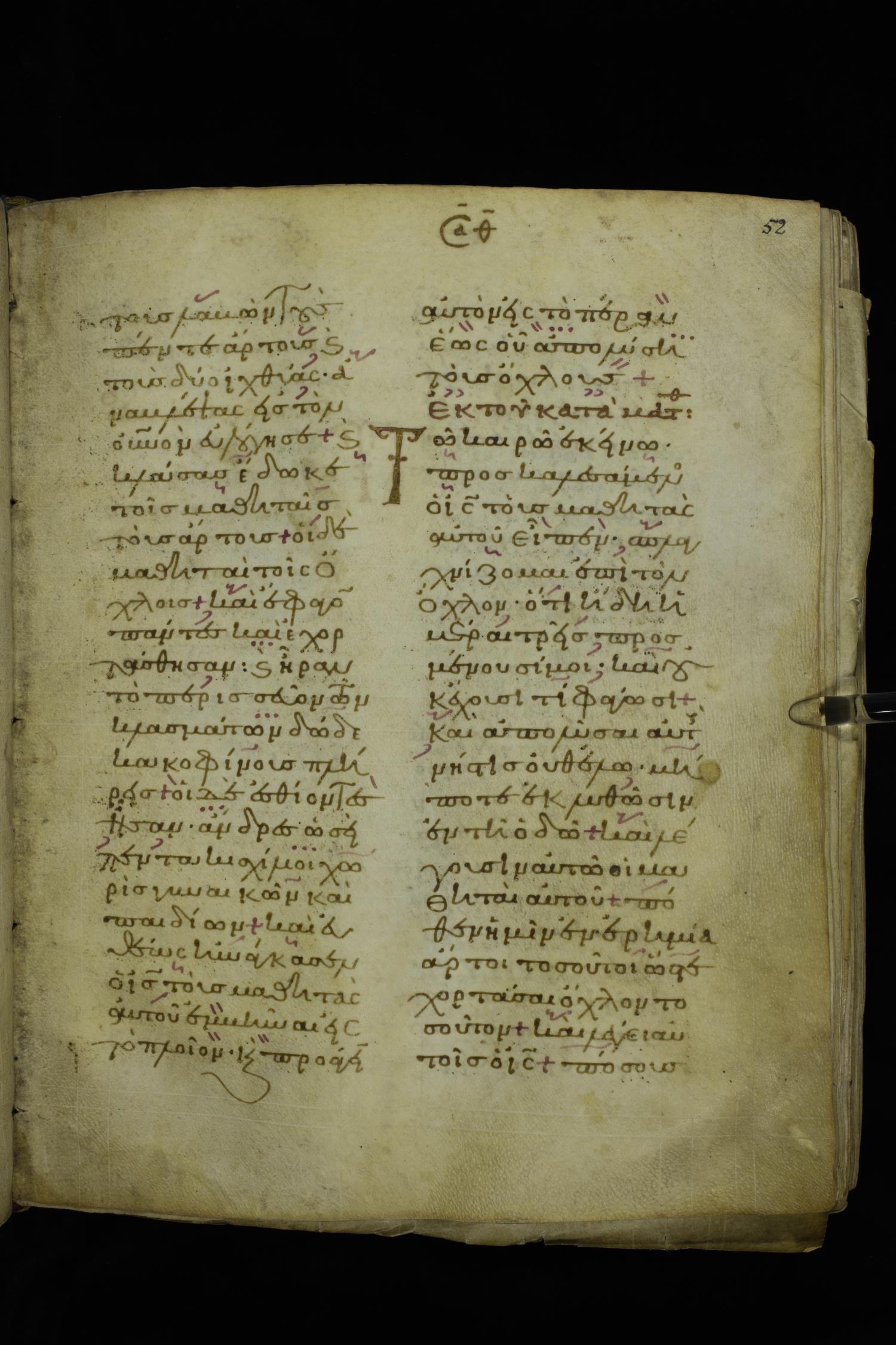 Twelfth century lectionary of the Gospels on parchment; 220 leaves, 2 columns, 24 lines per column. Images were taken at the National Library of Greece in Athens.