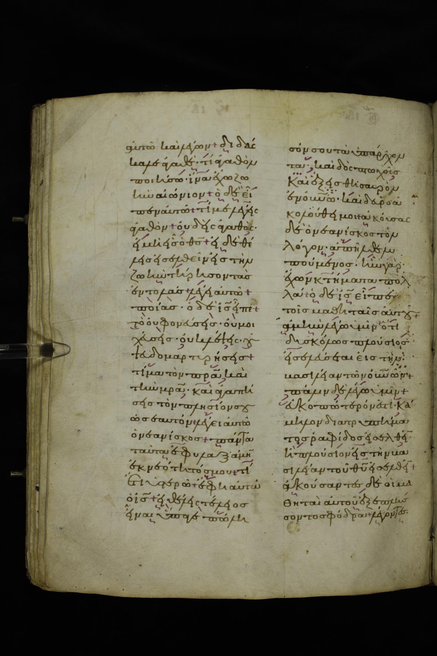 Twelfth century lectionary of the Gospels on parchment; 220 leaves, 2 columns, 24 lines per column. Images were taken at the National Library of Greece in Athens.