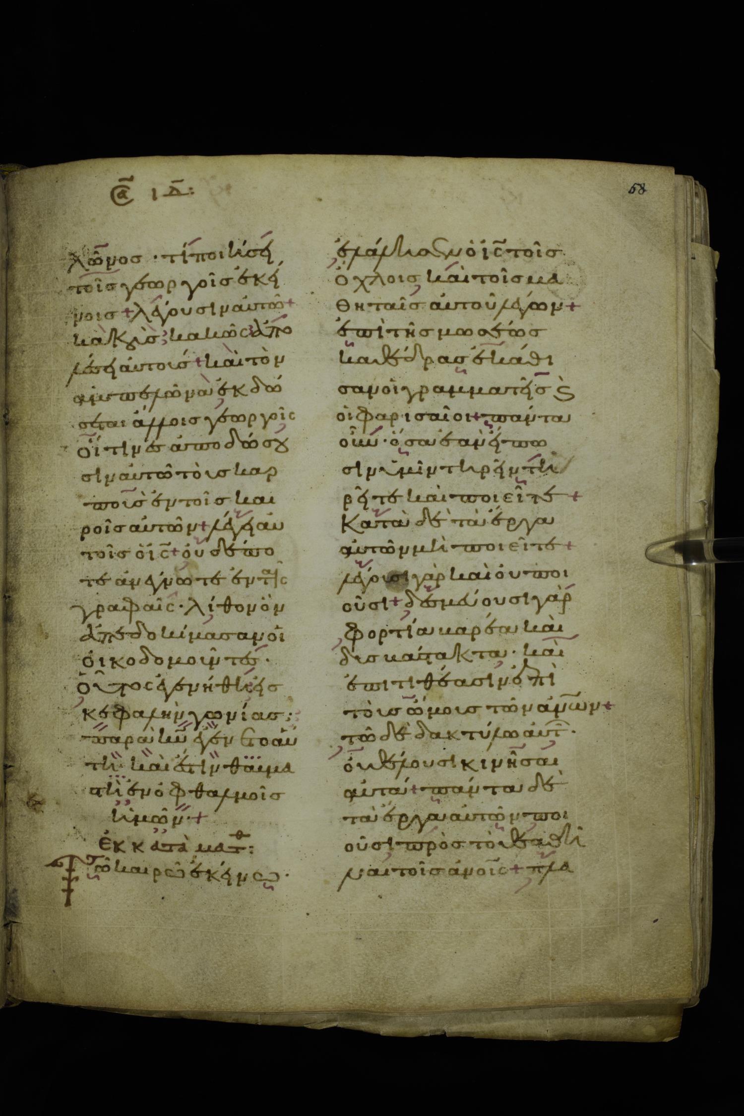 Twelfth century lectionary of the Gospels on parchment; 220 leaves, 2 columns, 24 lines per column. Images were taken at the National Library of Greece in Athens.