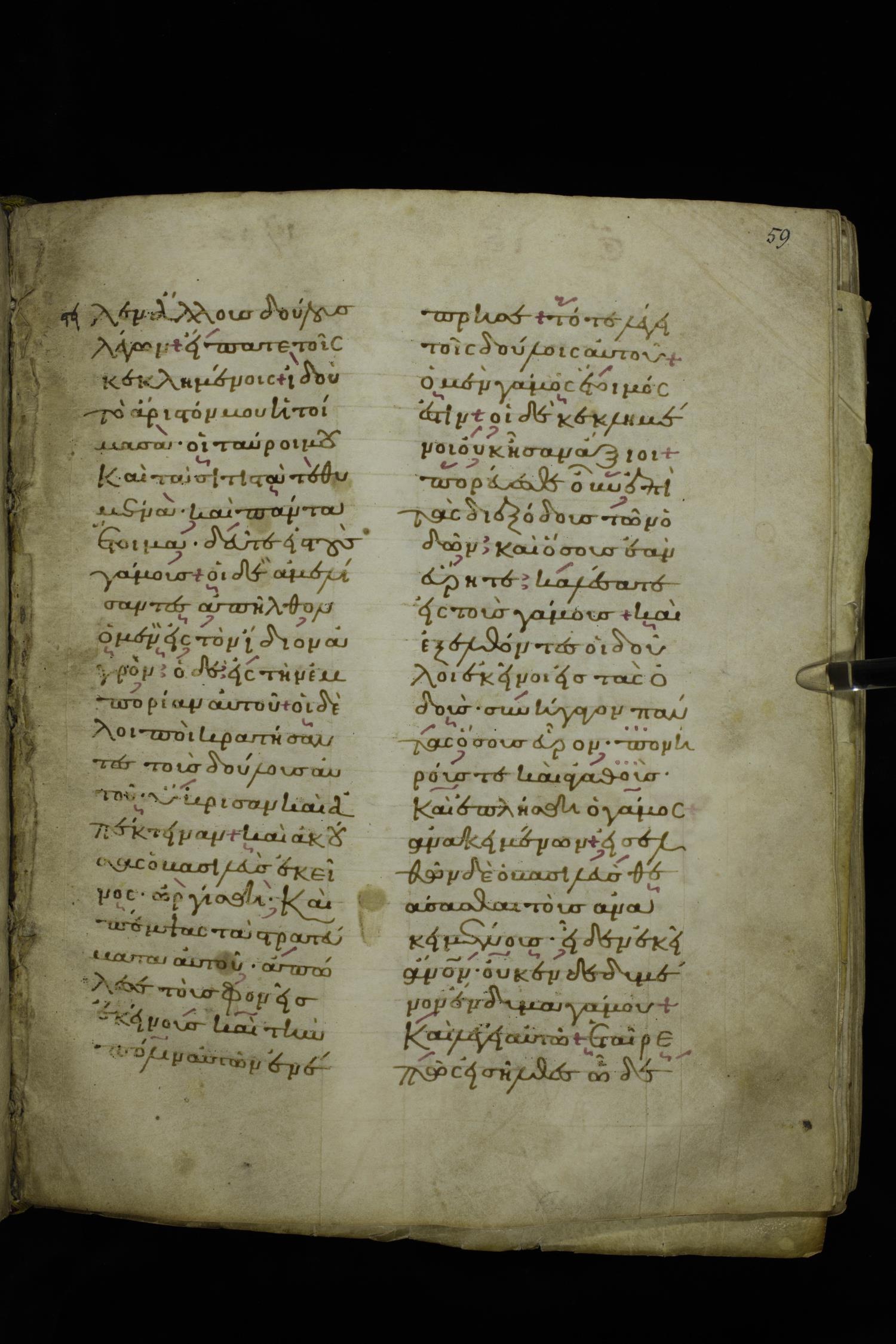 Twelfth century lectionary of the Gospels on parchment; 220 leaves, 2 columns, 24 lines per column. Images were taken at the National Library of Greece in Athens.