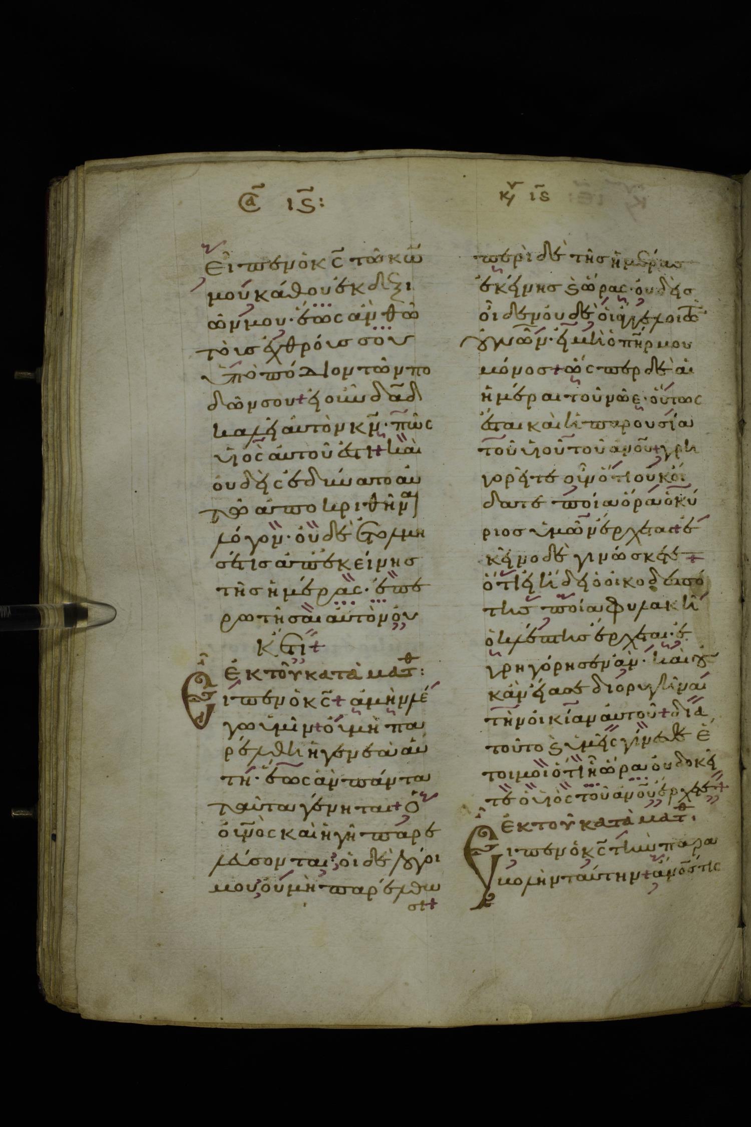 Twelfth century lectionary of the Gospels on parchment; 220 leaves, 2 columns, 24 lines per column. Images were taken at the National Library of Greece in Athens.