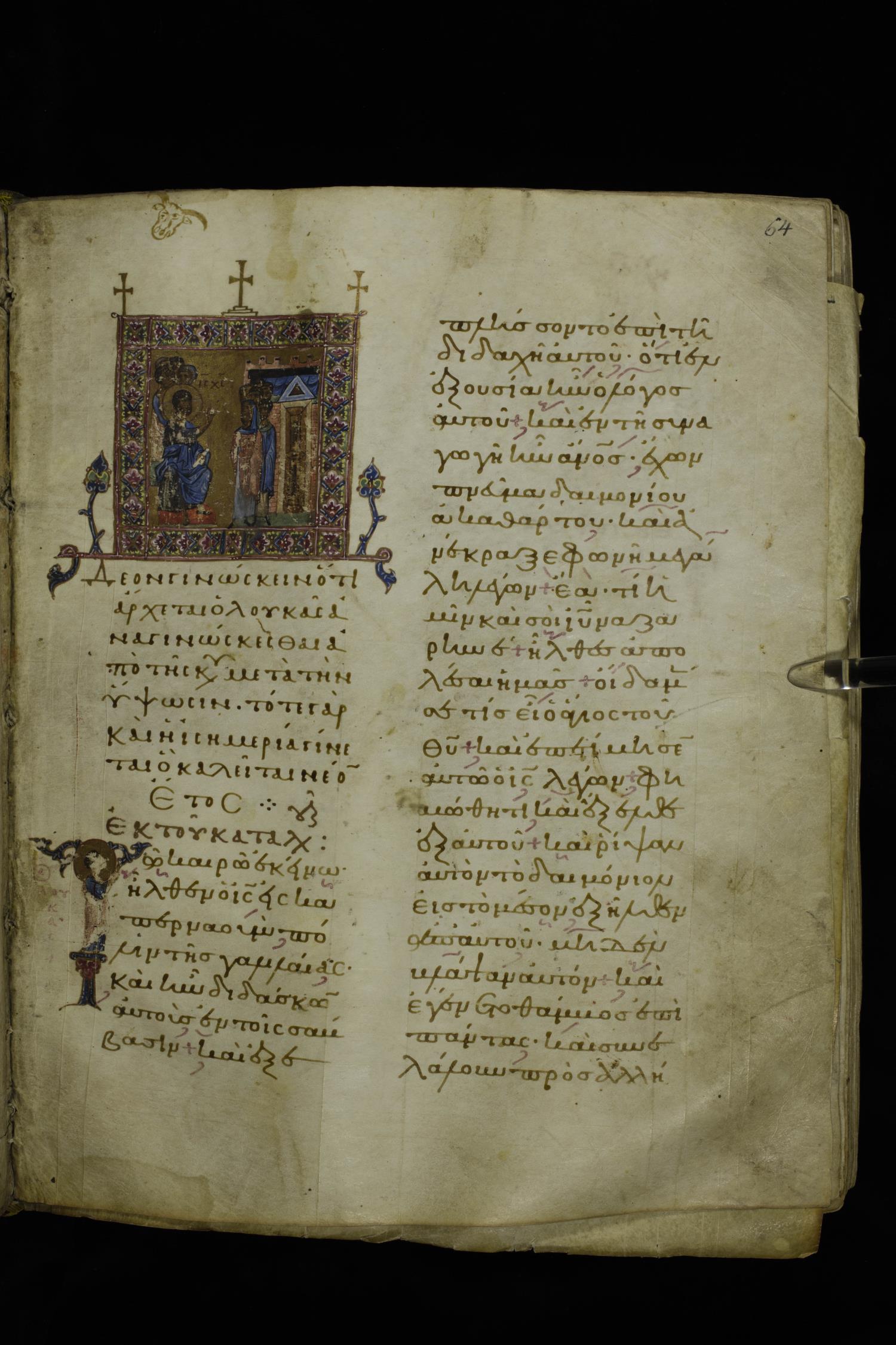 Twelfth century lectionary of the Gospels on parchment; 220 leaves, 2 columns, 24 lines per column. Images were taken at the National Library of Greece in Athens.