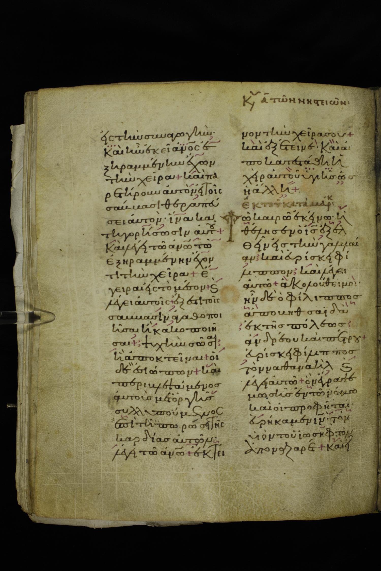 Twelfth century lectionary of the Gospels on parchment; 220 leaves, 2 columns, 24 lines per column. Images were taken at the National Library of Greece in Athens.