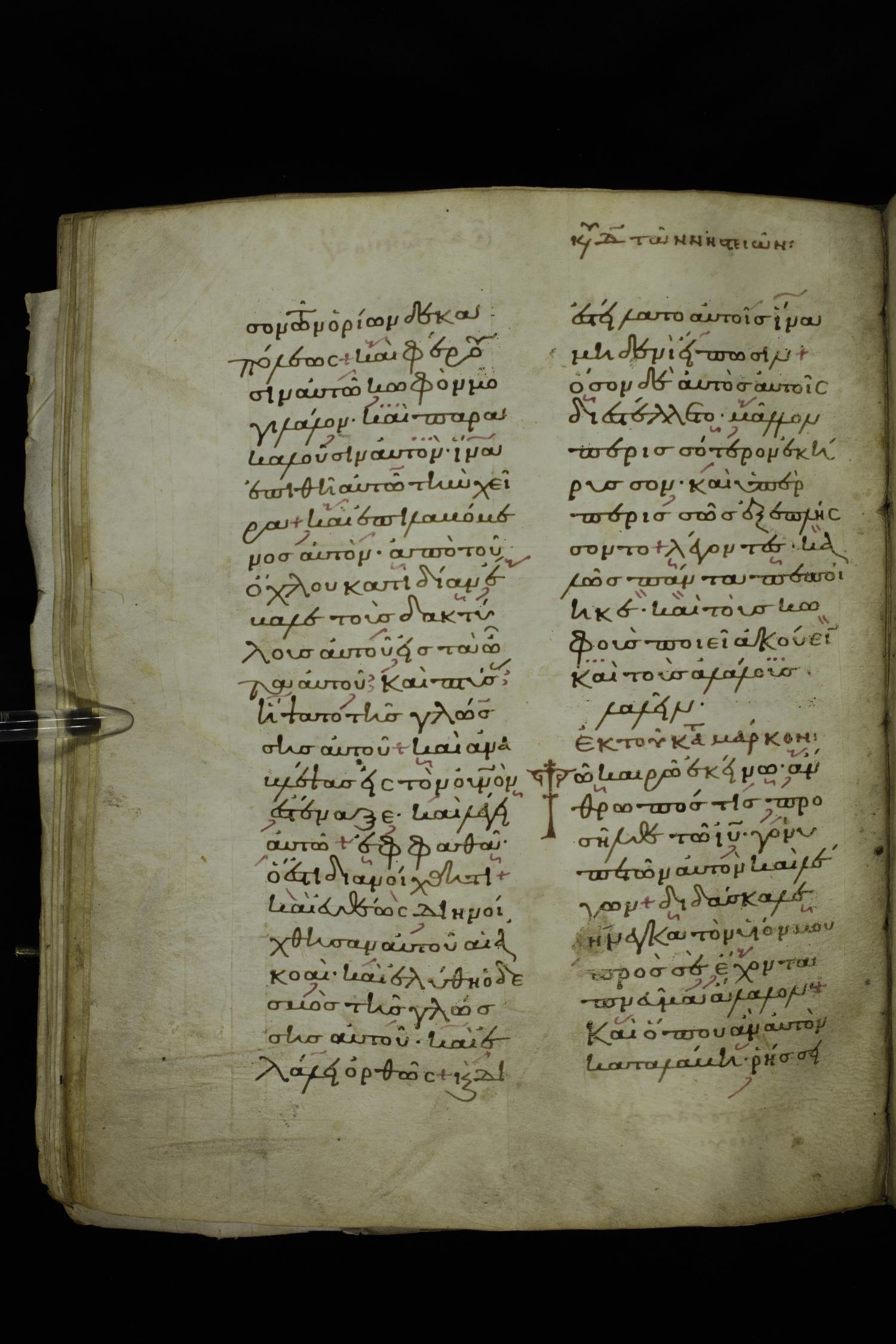 Twelfth century lectionary of the Gospels on parchment; 220 leaves, 2 columns, 24 lines per column. Images were taken at the National Library of Greece in Athens.