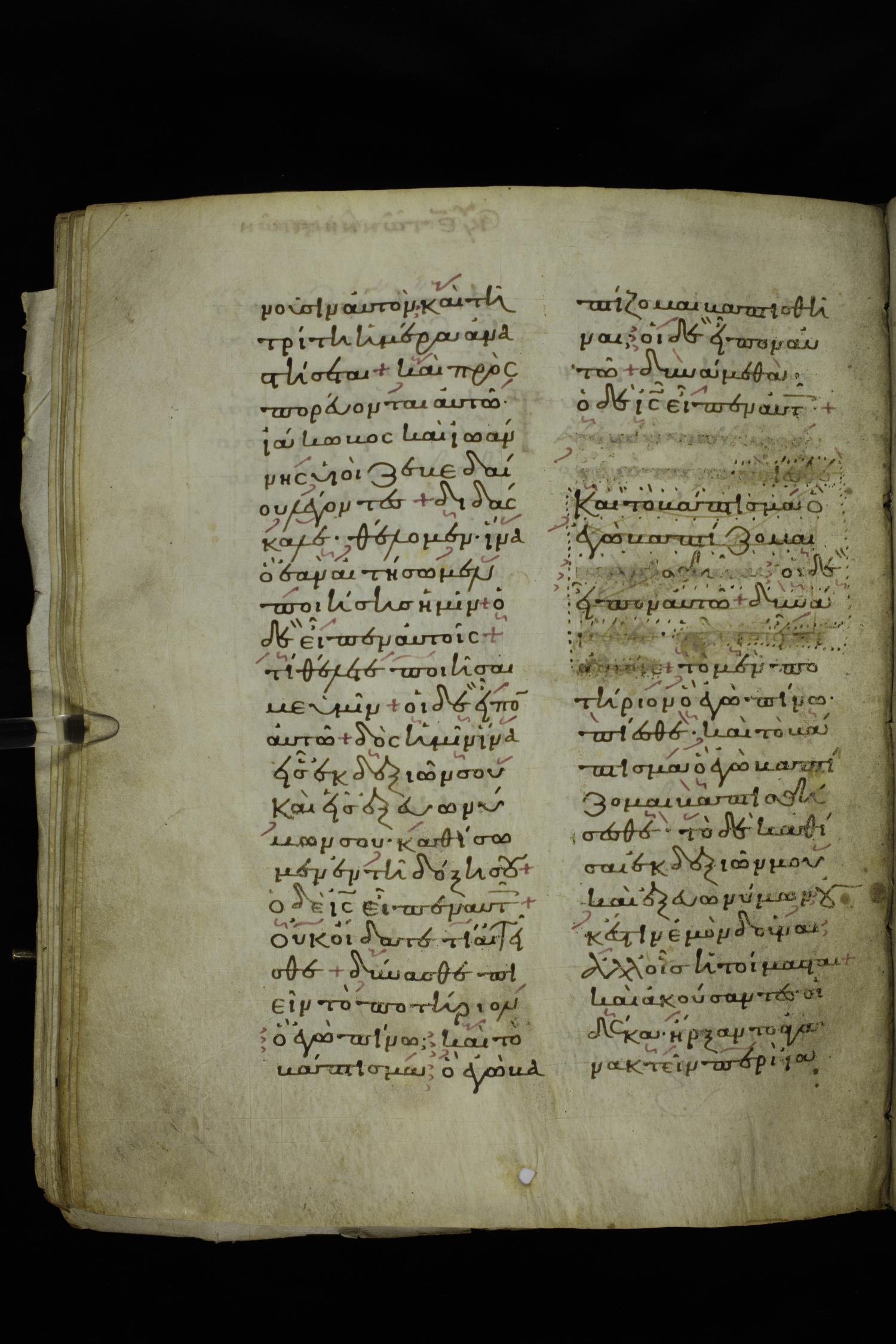 Twelfth century lectionary of the Gospels on parchment; 220 leaves, 2 columns, 24 lines per column. Images were taken at the National Library of Greece in Athens.