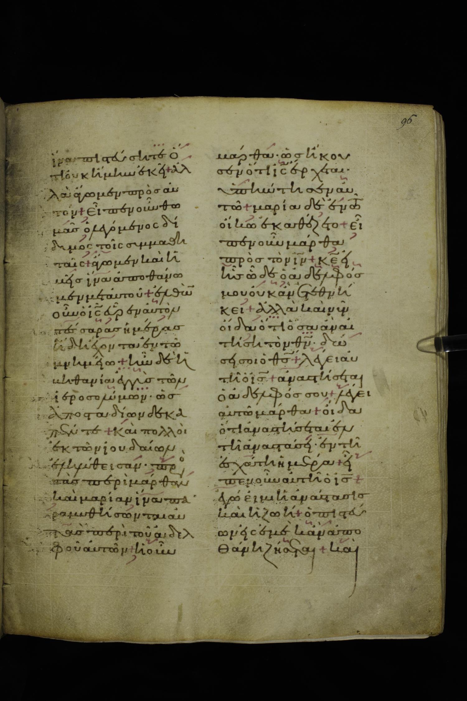 Twelfth century lectionary of the Gospels on parchment; 220 leaves, 2 columns, 24 lines per column. Images were taken at the National Library of Greece in Athens.