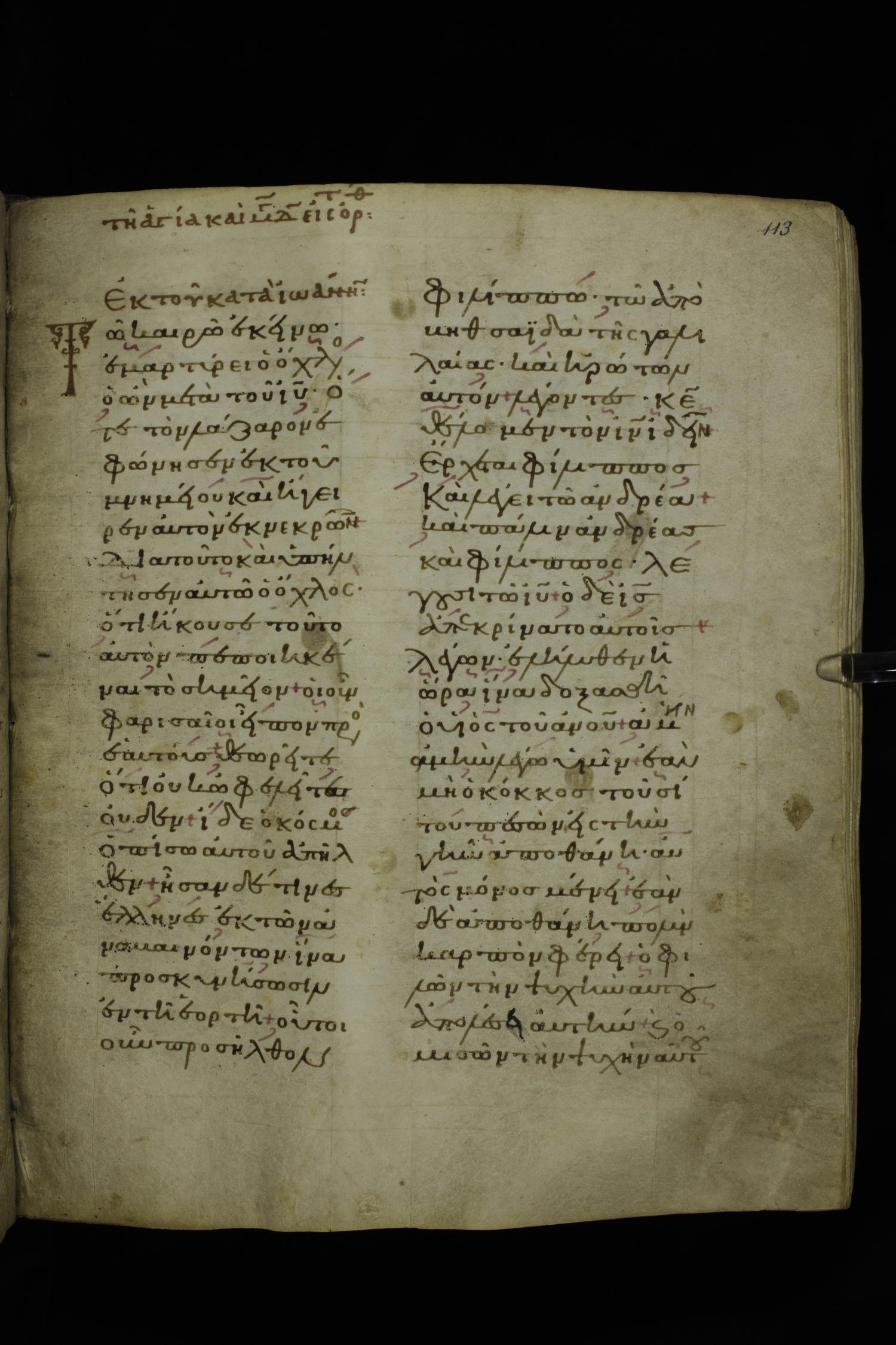 Twelfth century lectionary of the Gospels on parchment; 220 leaves, 2 columns, 24 lines per column. Images were taken at the National Library of Greece in Athens.