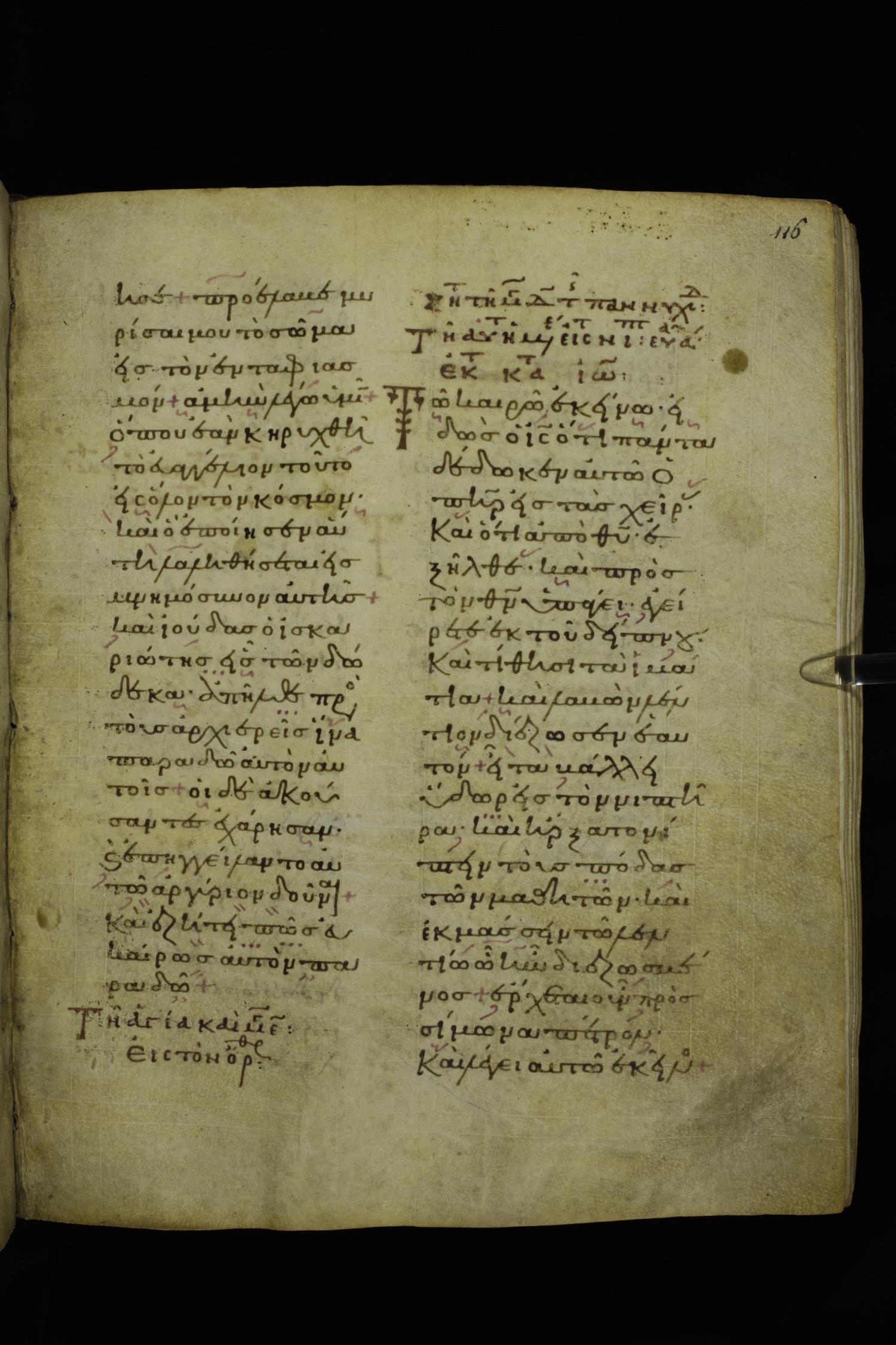 Twelfth century lectionary of the Gospels on parchment; 220 leaves, 2 columns, 24 lines per column. Images were taken at the National Library of Greece in Athens.