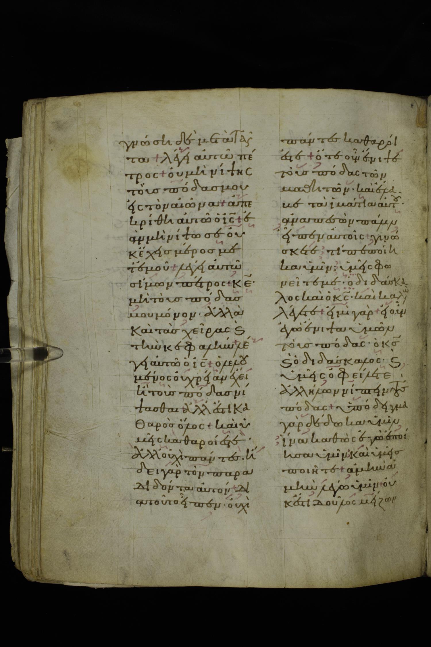 Twelfth century lectionary of the Gospels on parchment; 220 leaves, 2 columns, 24 lines per column. Images were taken at the National Library of Greece in Athens.