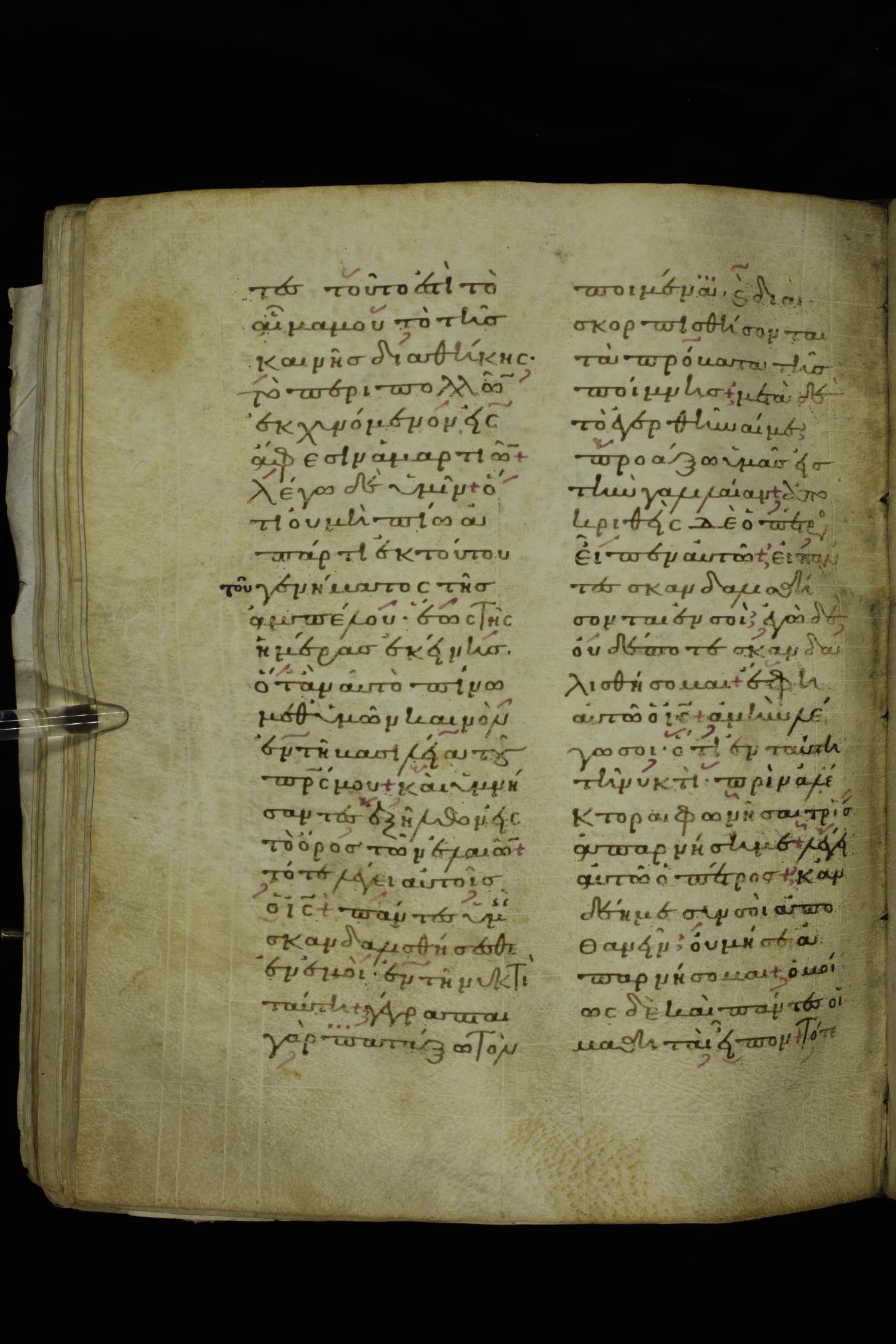 Twelfth century lectionary of the Gospels on parchment; 220 leaves, 2 columns, 24 lines per column. Images were taken at the National Library of Greece in Athens.