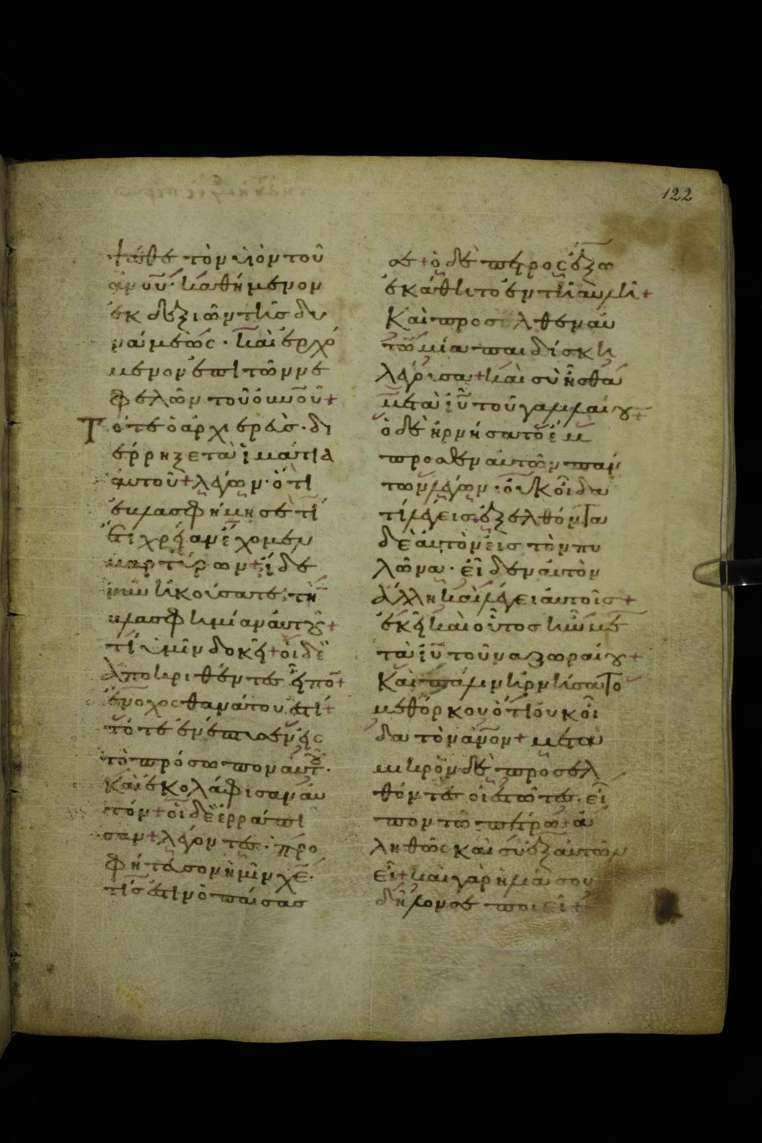 Twelfth century lectionary of the Gospels on parchment; 220 leaves, 2 columns, 24 lines per column. Images were taken at the National Library of Greece in Athens.