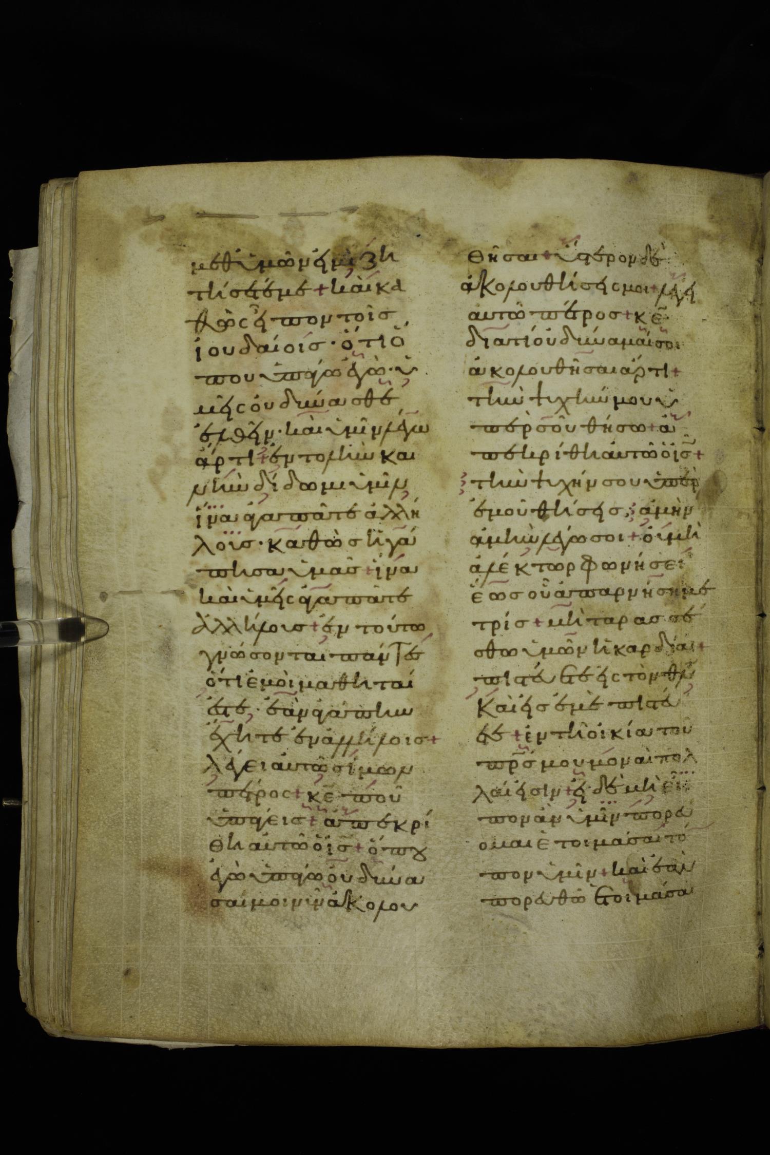 Twelfth century lectionary of the Gospels on parchment; 220 leaves, 2 columns, 24 lines per column. Images were taken at the National Library of Greece in Athens.