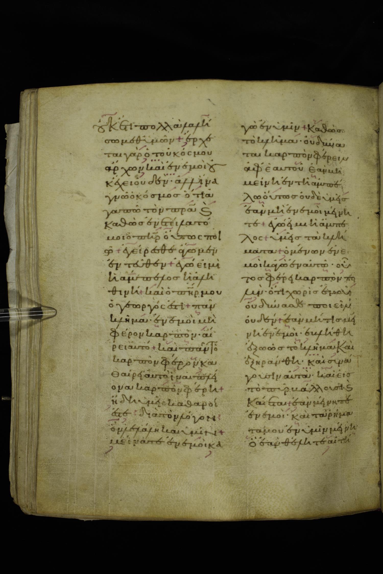 Twelfth century lectionary of the Gospels on parchment; 220 leaves, 2 columns, 24 lines per column. Images were taken at the National Library of Greece in Athens.