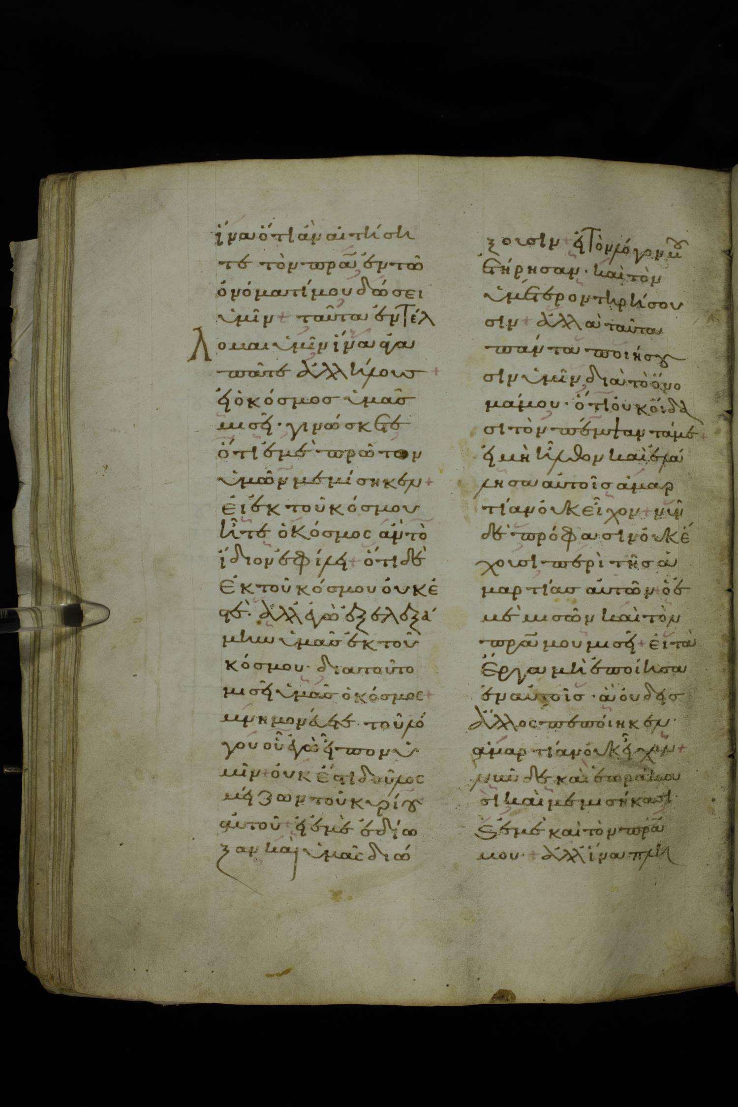 Twelfth century lectionary of the Gospels on parchment; 220 leaves, 2 columns, 24 lines per column. Images were taken at the National Library of Greece in Athens.