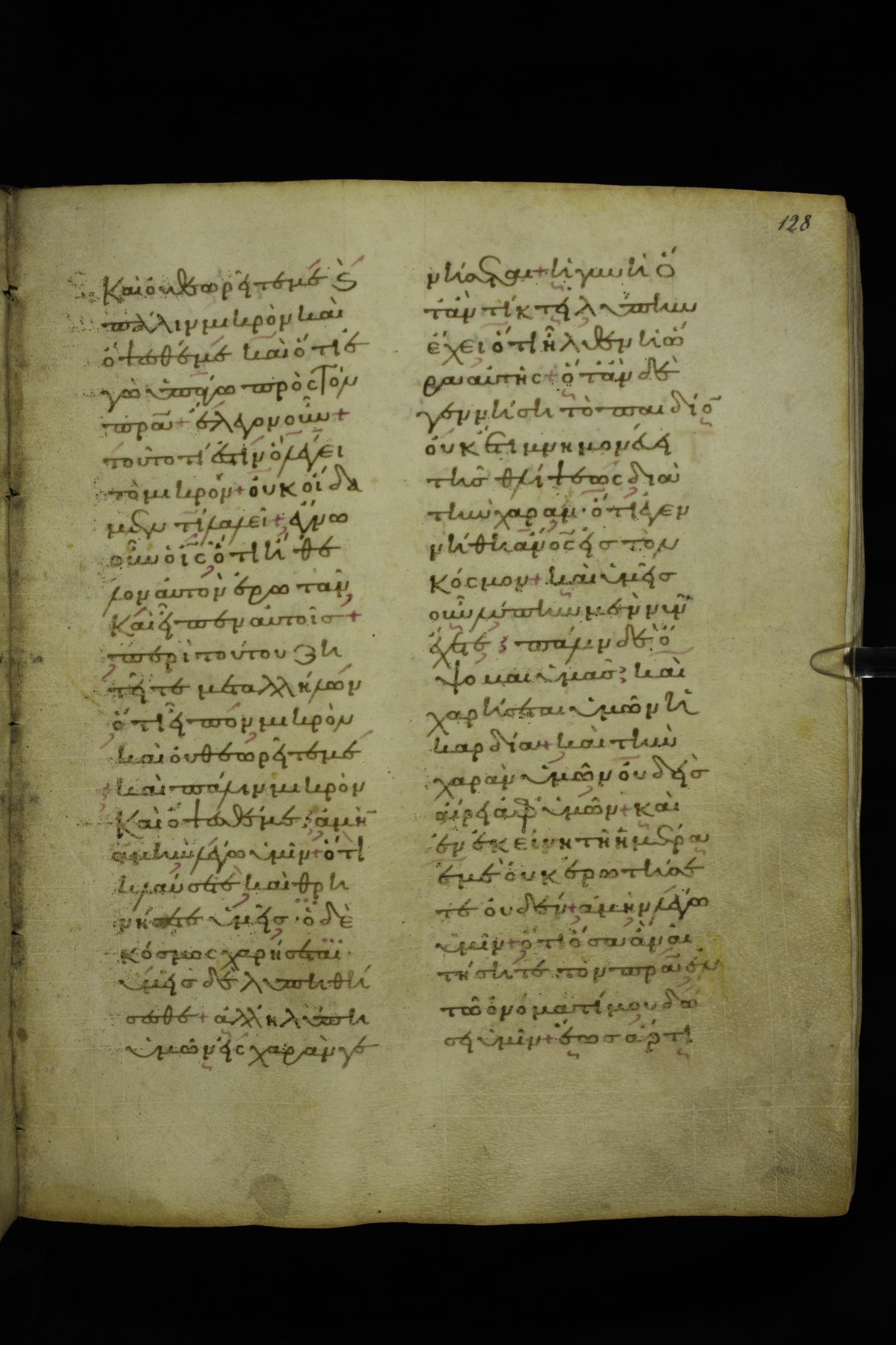 Twelfth century lectionary of the Gospels on parchment; 220 leaves, 2 columns, 24 lines per column. Images were taken at the National Library of Greece in Athens.