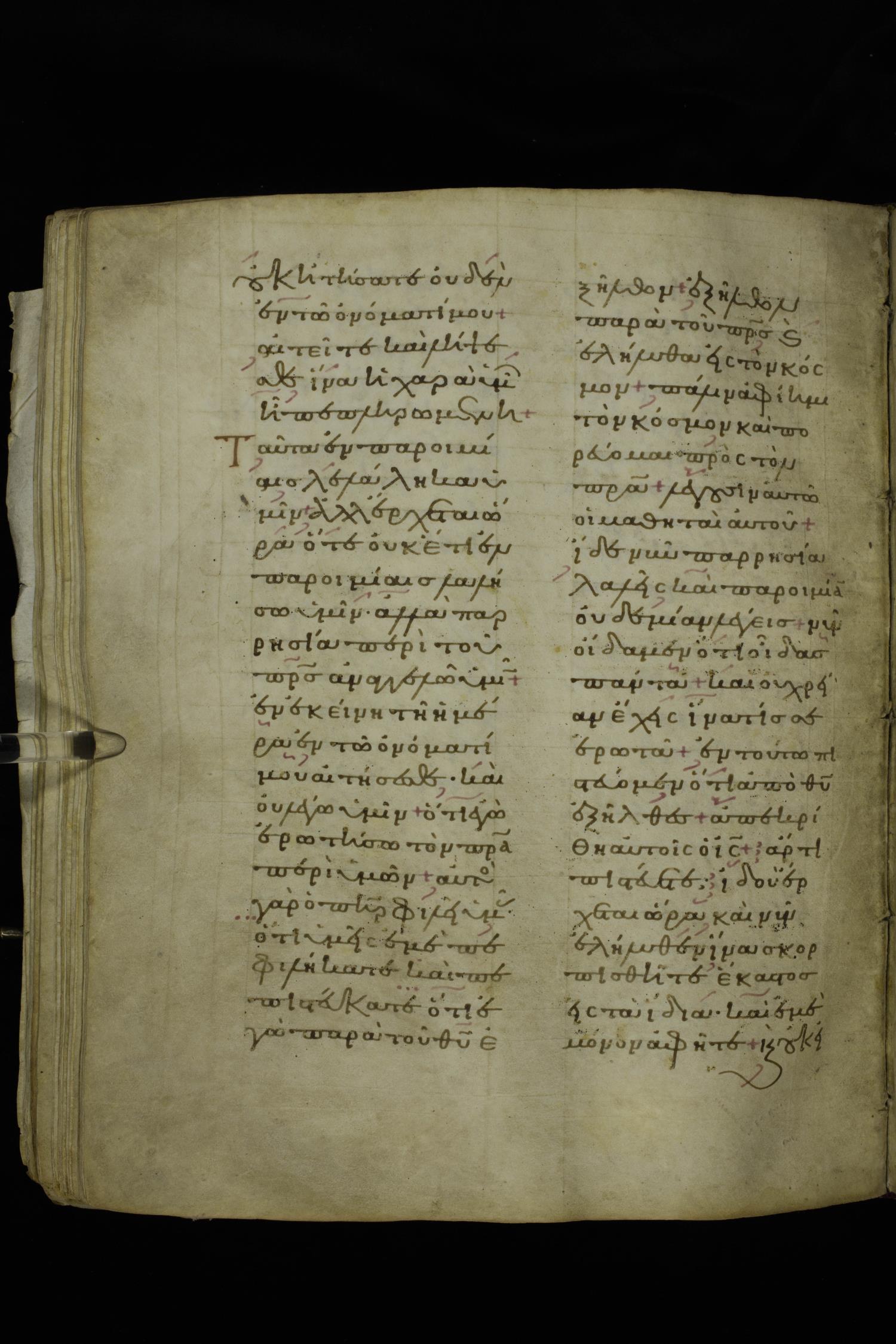 Twelfth century lectionary of the Gospels on parchment; 220 leaves, 2 columns, 24 lines per column. Images were taken at the National Library of Greece in Athens.