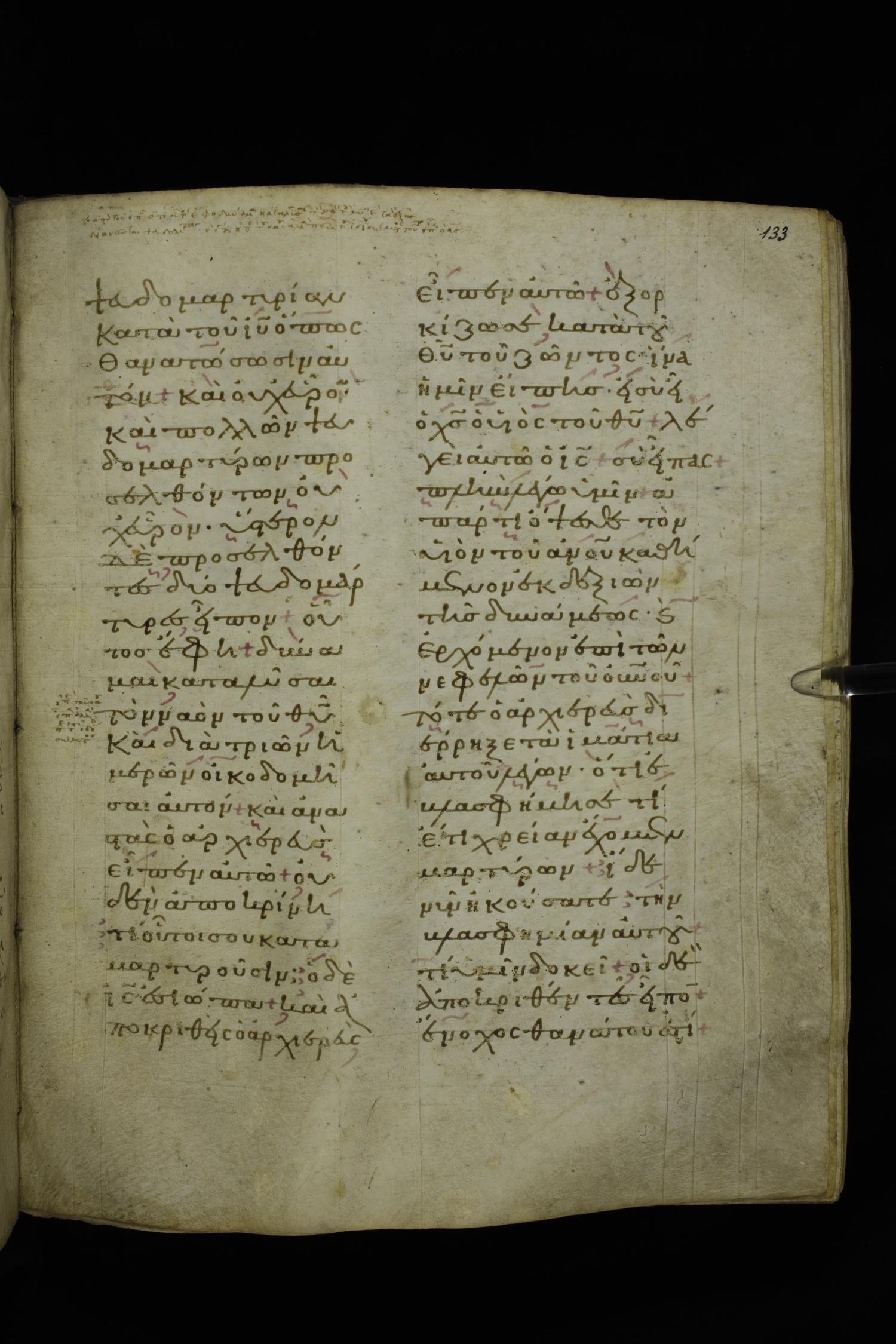 Twelfth century lectionary of the Gospels on parchment; 220 leaves, 2 columns, 24 lines per column. Images were taken at the National Library of Greece in Athens.