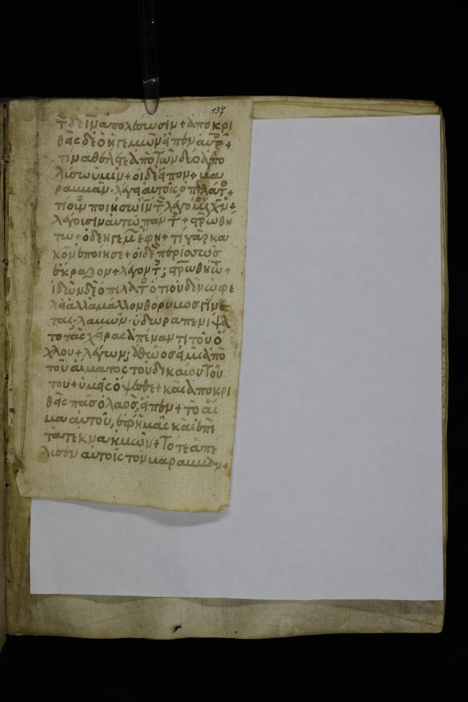 Twelfth century lectionary of the Gospels on parchment; 220 leaves, 2 columns, 24 lines per column. Images were taken at the National Library of Greece in Athens.