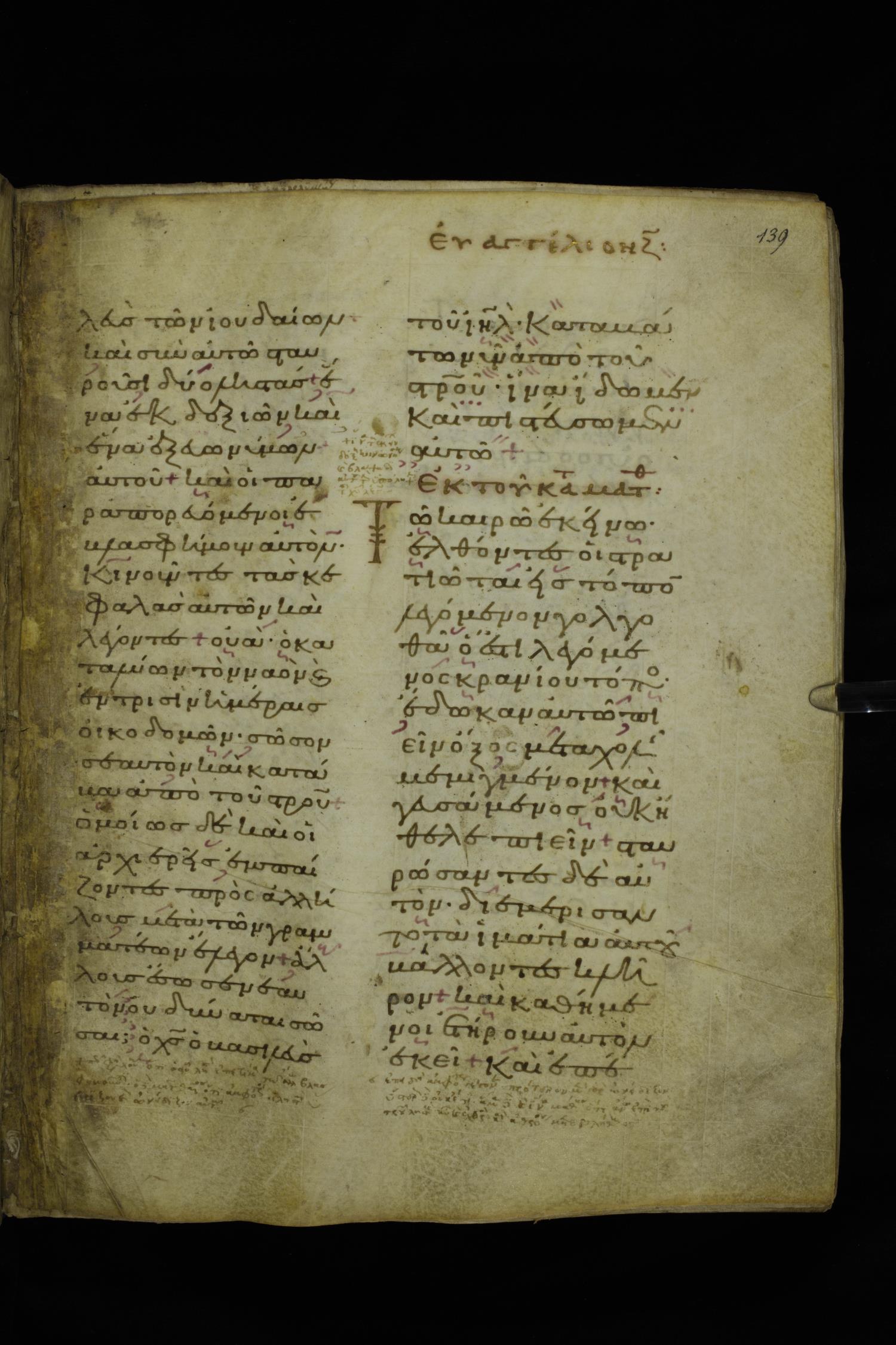 Twelfth century lectionary of the Gospels on parchment; 220 leaves, 2 columns, 24 lines per column. Images were taken at the National Library of Greece in Athens.