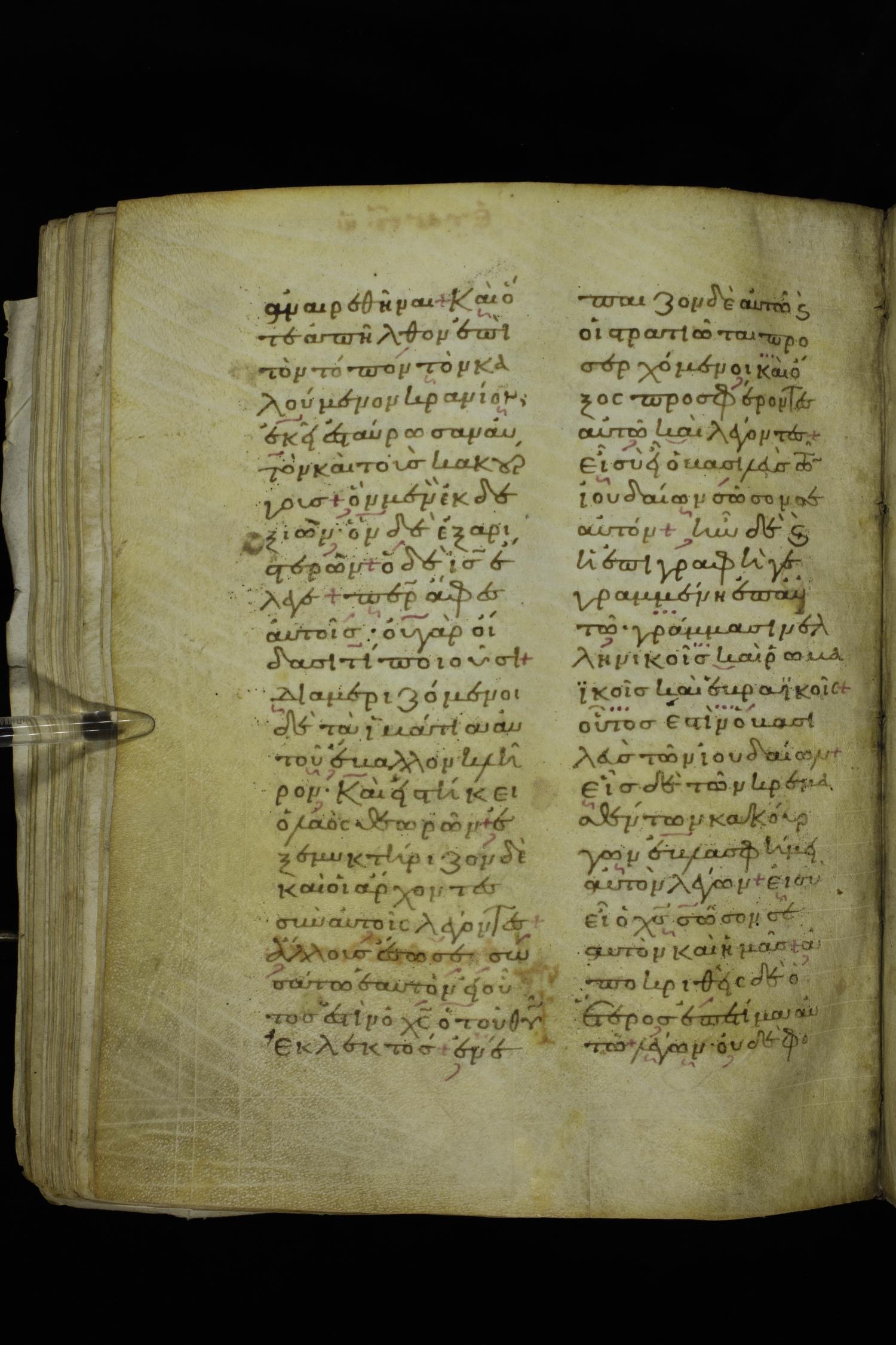Twelfth century lectionary of the Gospels on parchment; 220 leaves, 2 columns, 24 lines per column. Images were taken at the National Library of Greece in Athens.