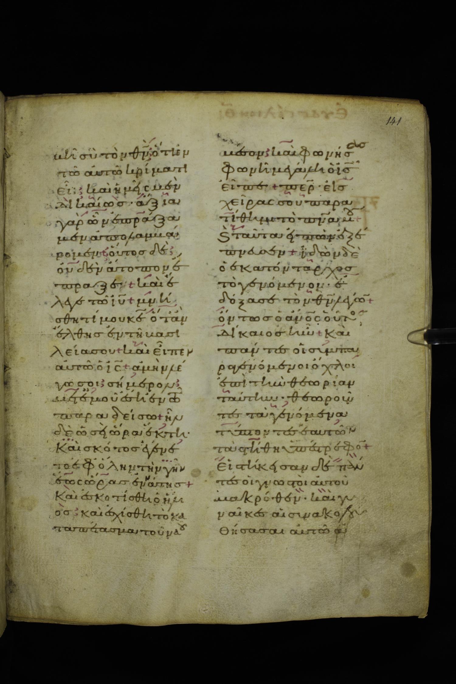 Twelfth century lectionary of the Gospels on parchment; 220 leaves, 2 columns, 24 lines per column. Images were taken at the National Library of Greece in Athens.