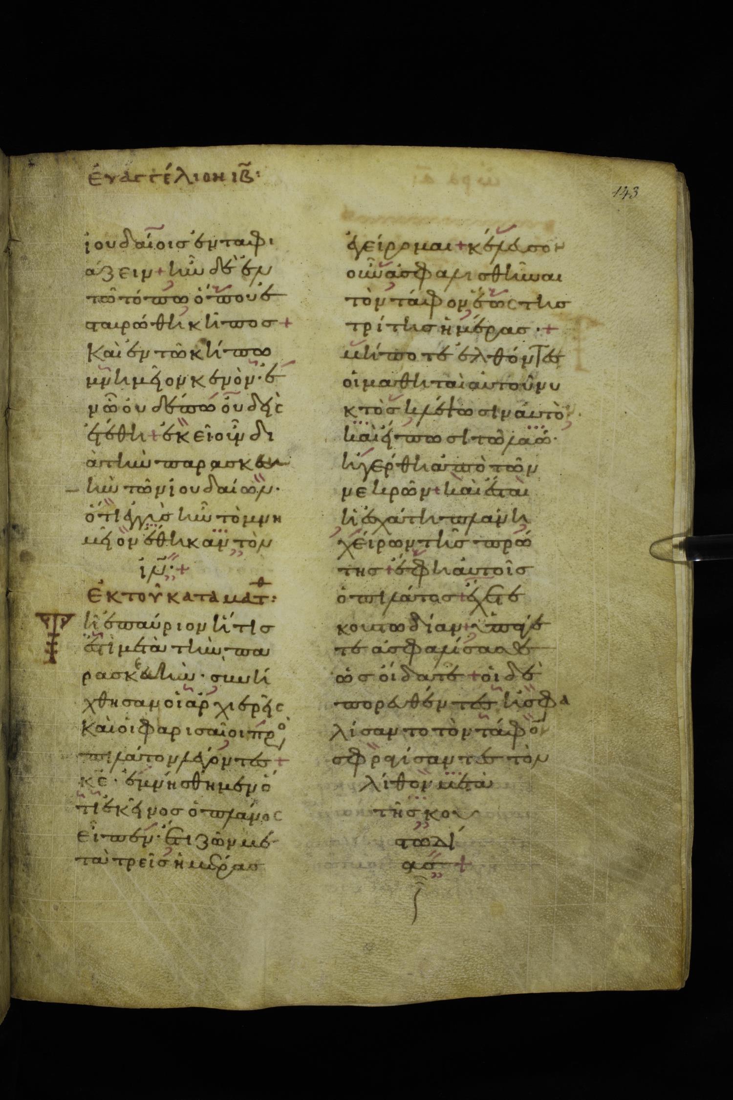 Twelfth century lectionary of the Gospels on parchment; 220 leaves, 2 columns, 24 lines per column. Images were taken at the National Library of Greece in Athens.