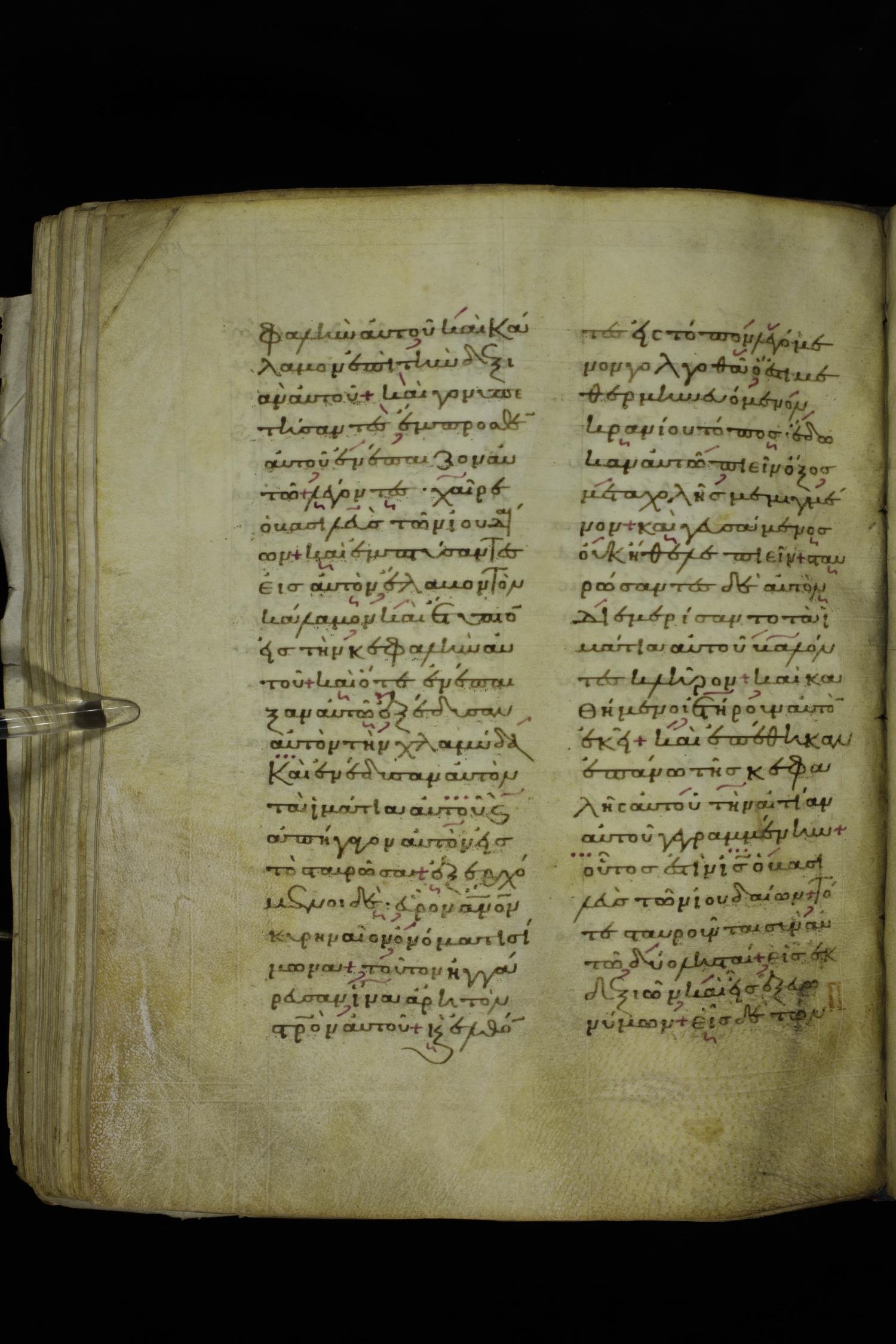 Twelfth century lectionary of the Gospels on parchment; 220 leaves, 2 columns, 24 lines per column. Images were taken at the National Library of Greece in Athens.