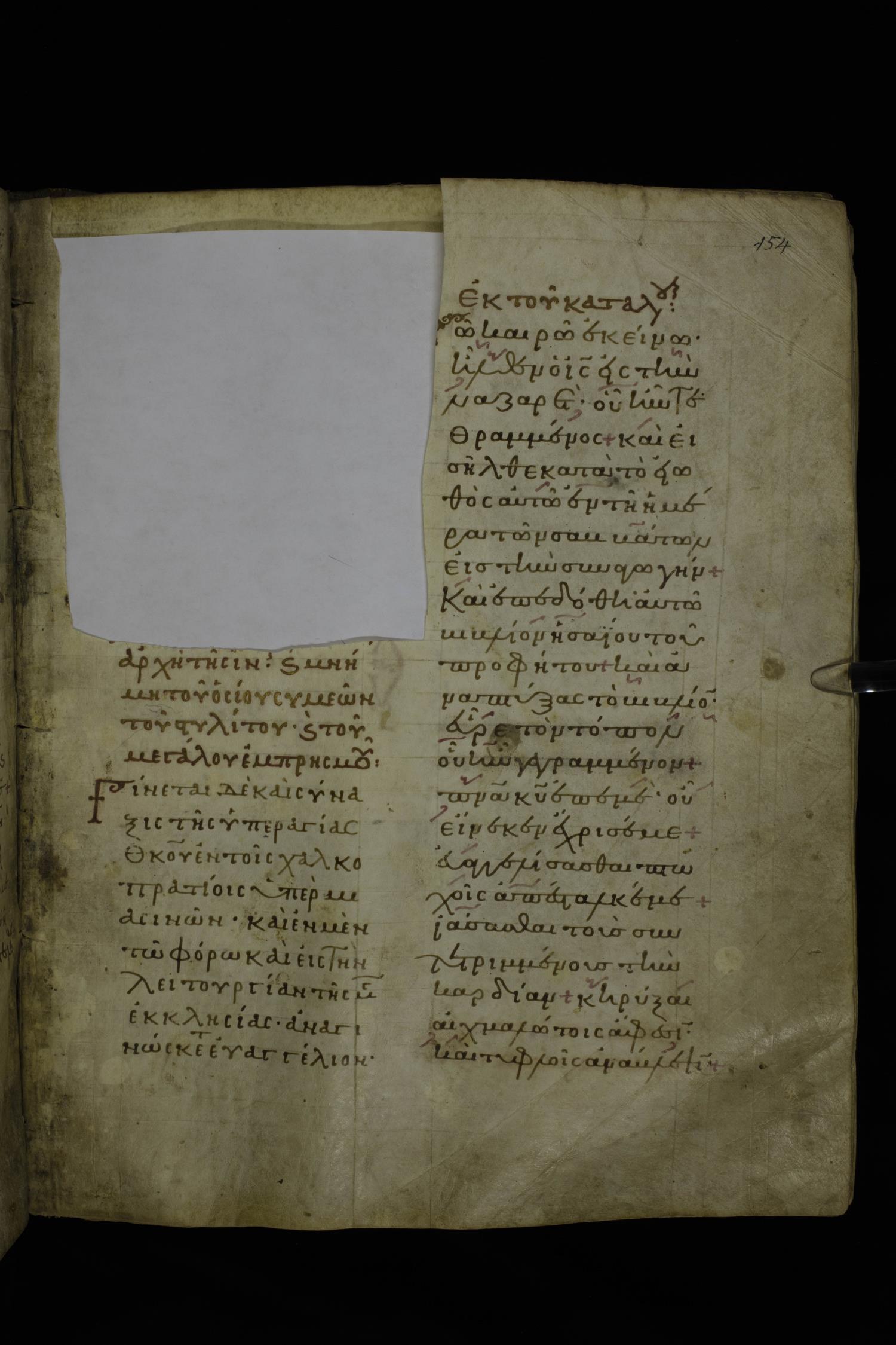Twelfth century lectionary of the Gospels on parchment; 220 leaves, 2 columns, 24 lines per column. Images were taken at the National Library of Greece in Athens.