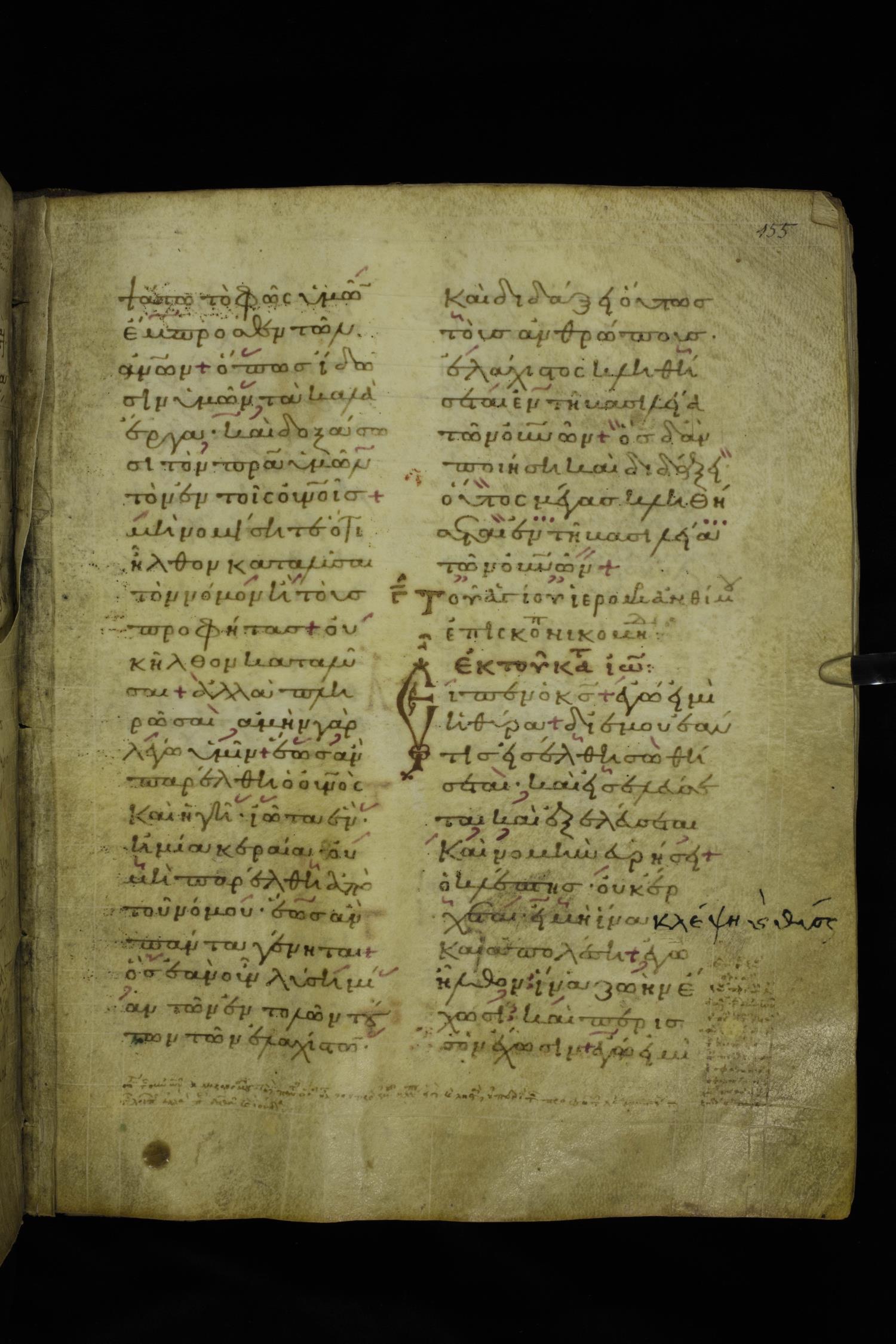 Twelfth century lectionary of the Gospels on parchment; 220 leaves, 2 columns, 24 lines per column. Images were taken at the National Library of Greece in Athens.