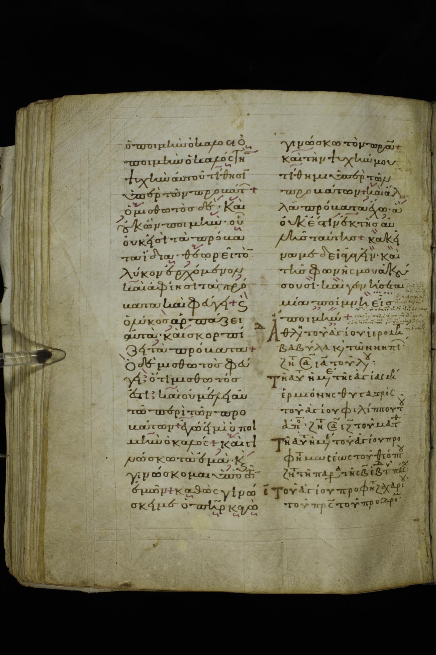 Twelfth century lectionary of the Gospels on parchment; 220 leaves, 2 columns, 24 lines per column. Images were taken at the National Library of Greece in Athens.