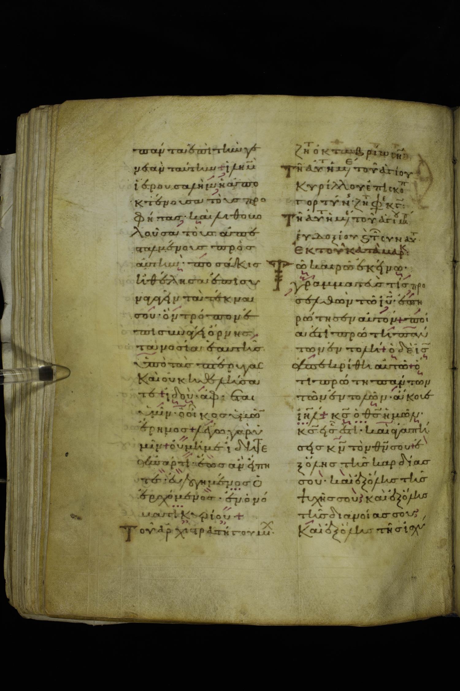 Twelfth century lectionary of the Gospels on parchment; 220 leaves, 2 columns, 24 lines per column. Images were taken at the National Library of Greece in Athens.