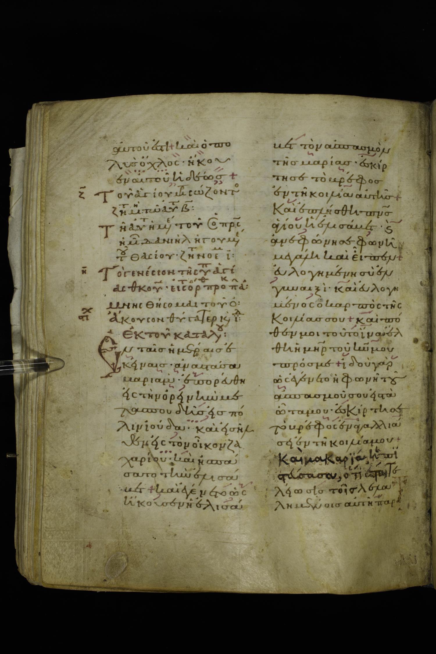 Twelfth century lectionary of the Gospels on parchment; 220 leaves, 2 columns, 24 lines per column. Images were taken at the National Library of Greece in Athens.