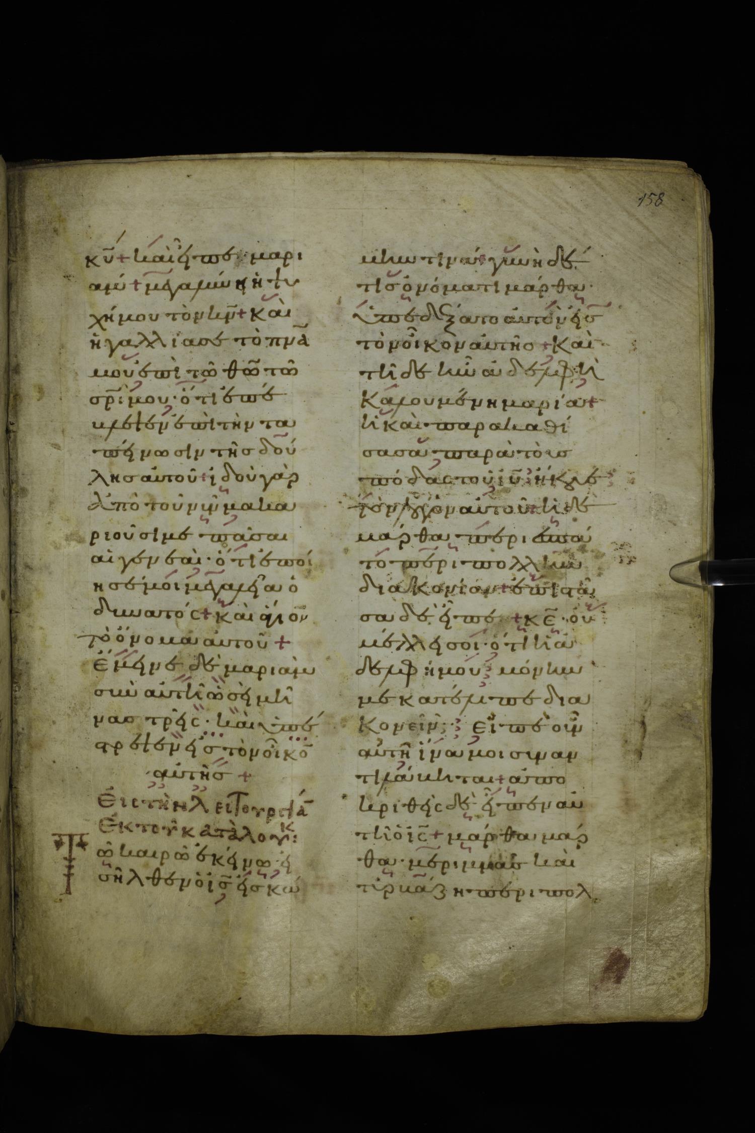Twelfth century lectionary of the Gospels on parchment; 220 leaves, 2 columns, 24 lines per column. Images were taken at the National Library of Greece in Athens.