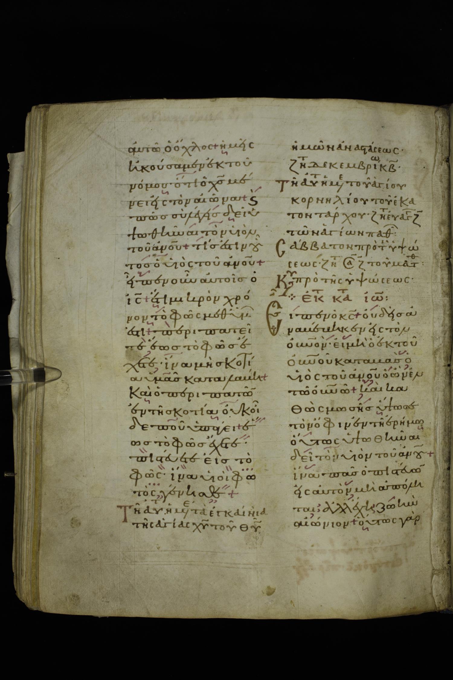 Twelfth century lectionary of the Gospels on parchment; 220 leaves, 2 columns, 24 lines per column. Images were taken at the National Library of Greece in Athens.