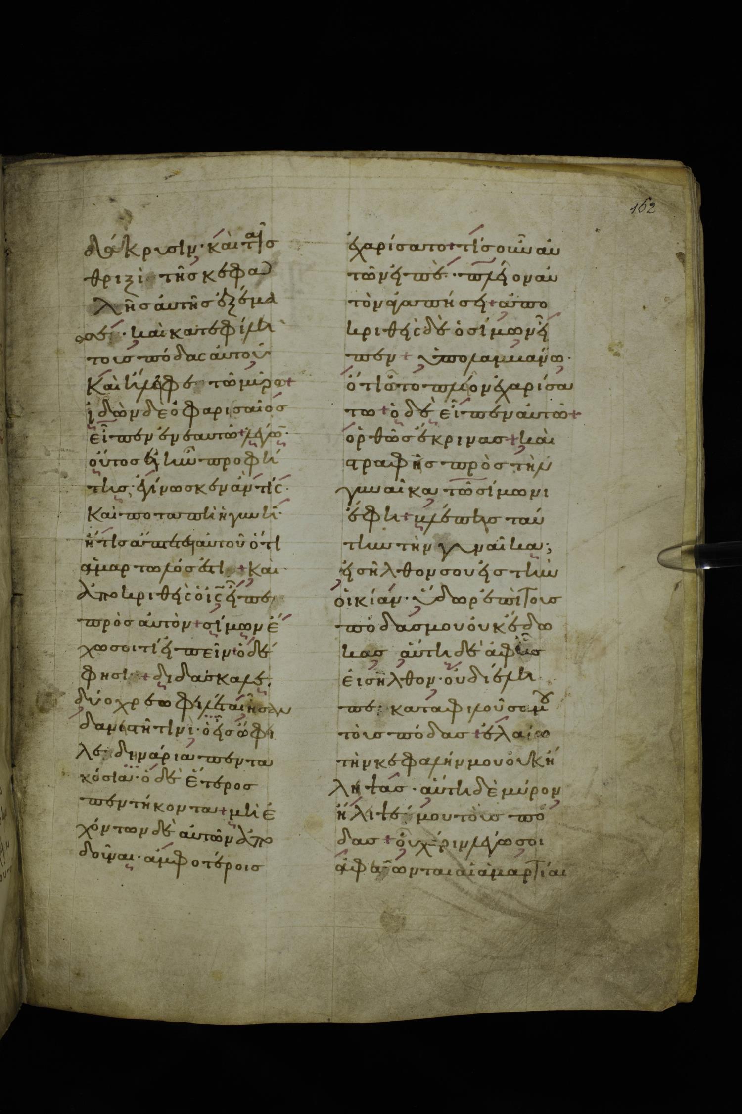 Twelfth century lectionary of the Gospels on parchment; 220 leaves, 2 columns, 24 lines per column. Images were taken at the National Library of Greece in Athens.