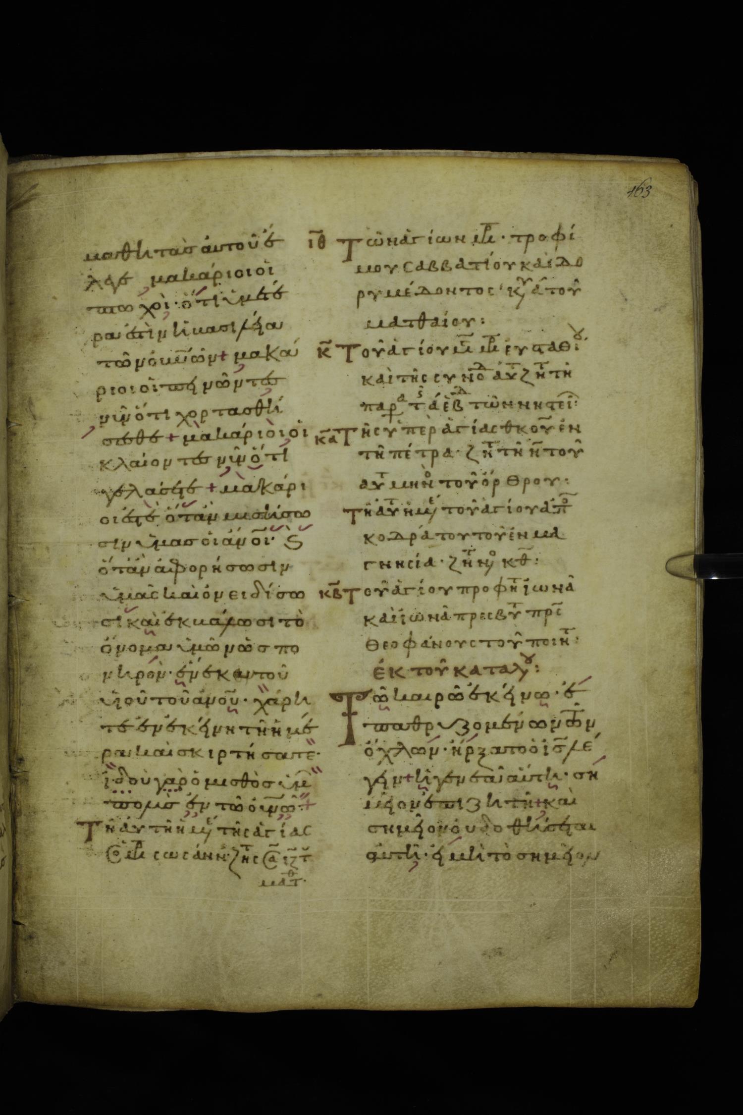 Twelfth century lectionary of the Gospels on parchment; 220 leaves, 2 columns, 24 lines per column. Images were taken at the National Library of Greece in Athens.