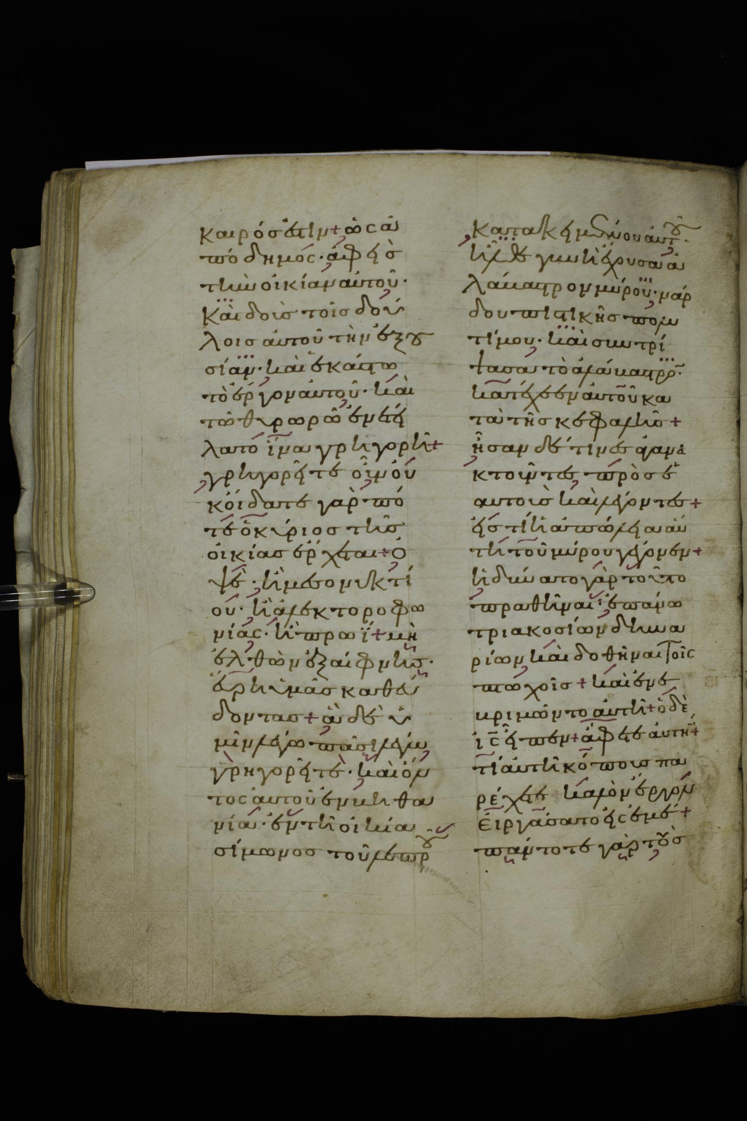 Twelfth century lectionary of the Gospels on parchment; 220 leaves, 2 columns, 24 lines per column. Images were taken at the National Library of Greece in Athens.