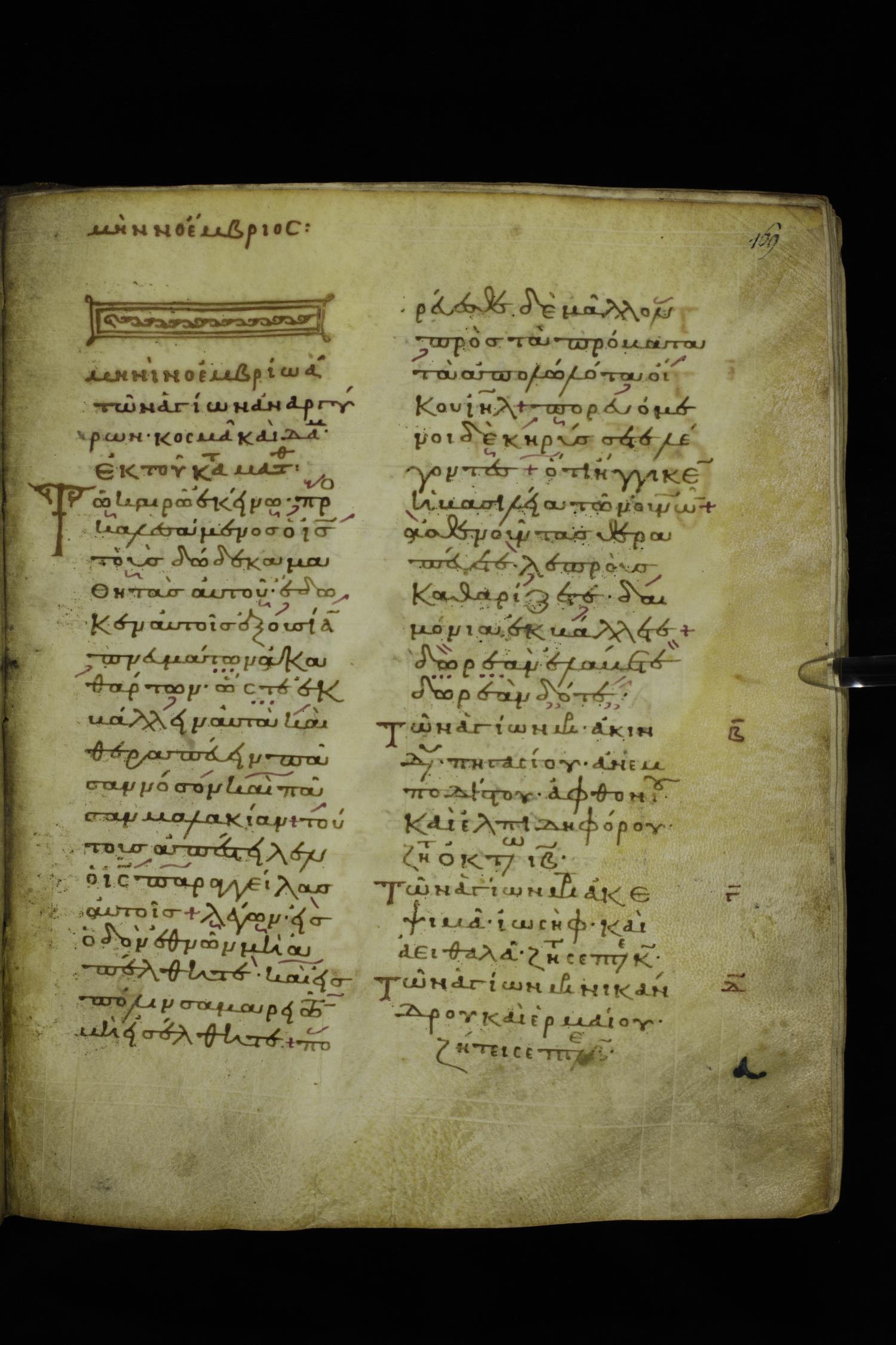 Twelfth century lectionary of the Gospels on parchment; 220 leaves, 2 columns, 24 lines per column. Images were taken at the National Library of Greece in Athens.