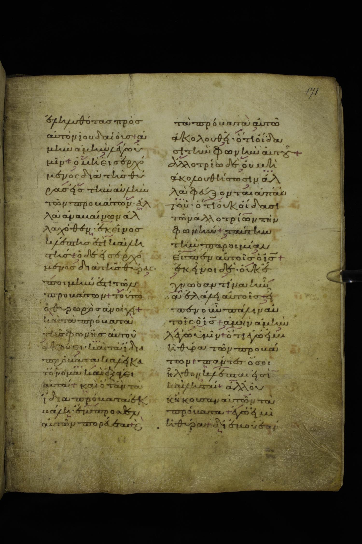Twelfth century lectionary of the Gospels on parchment; 220 leaves, 2 columns, 24 lines per column. Images were taken at the National Library of Greece in Athens.