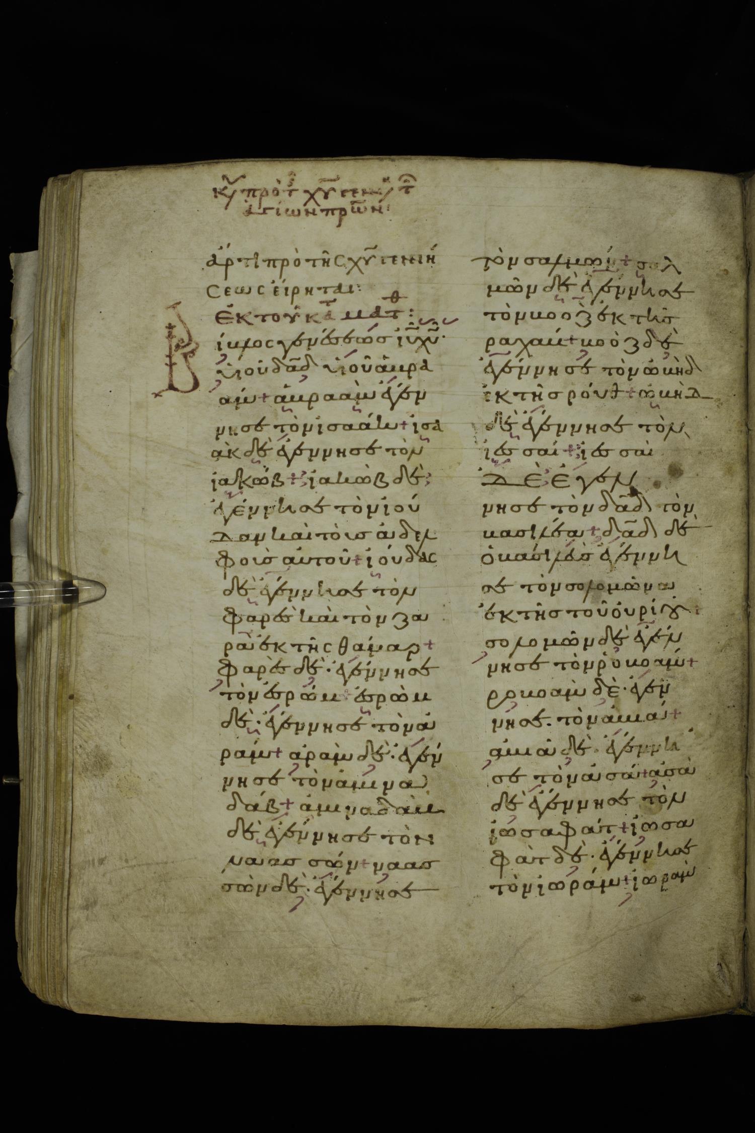 Twelfth century lectionary of the Gospels on parchment; 220 leaves, 2 columns, 24 lines per column. Images were taken at the National Library of Greece in Athens.