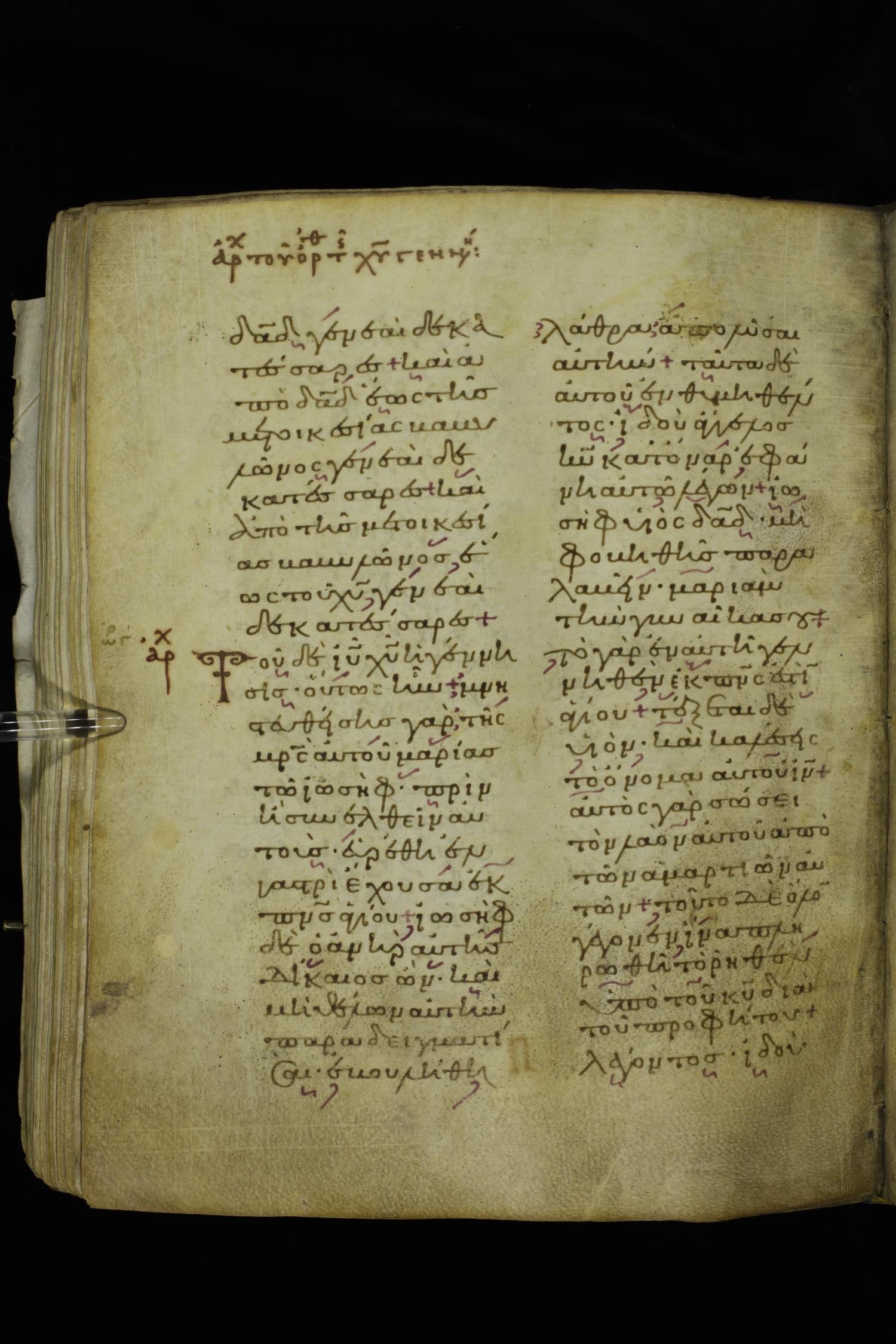 Twelfth century lectionary of the Gospels on parchment; 220 leaves, 2 columns, 24 lines per column. Images were taken at the National Library of Greece in Athens.