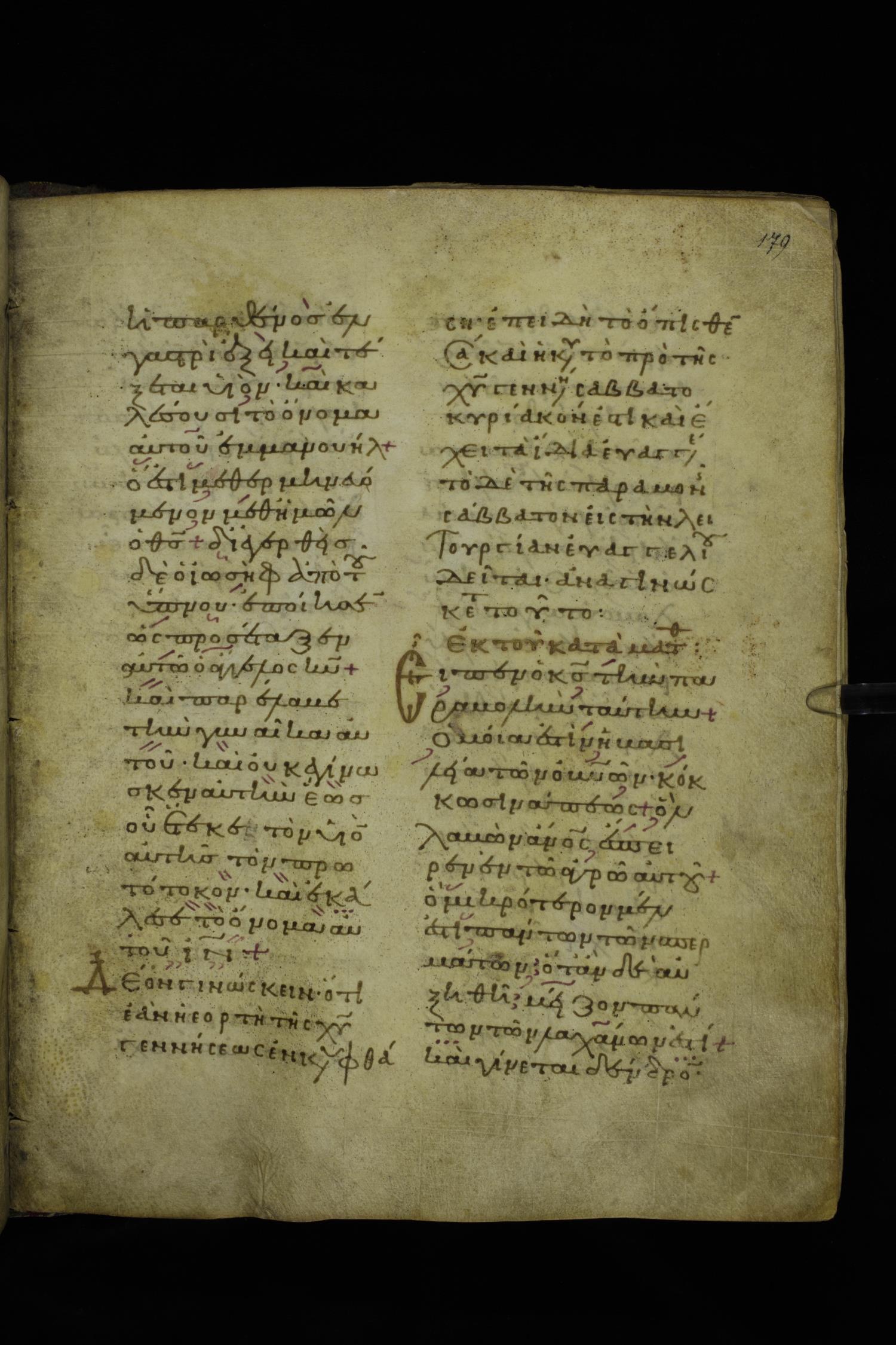 Twelfth century lectionary of the Gospels on parchment; 220 leaves, 2 columns, 24 lines per column. Images were taken at the National Library of Greece in Athens.
